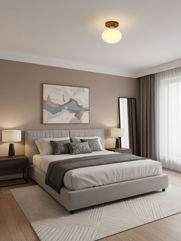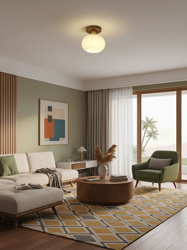 This white shell ceiling lamp adds a touch of elegance to any environment with its timeless beauty. Made from black walnut, copper, and opal glass, this lamp will bring soft, bright light into your home. Let it brighten your beauty and create a cozy atmosphere with its cute and charming appearance.