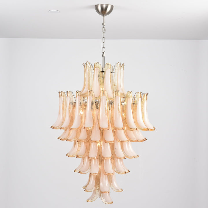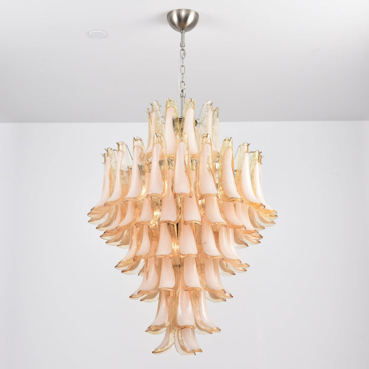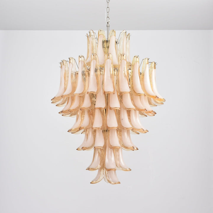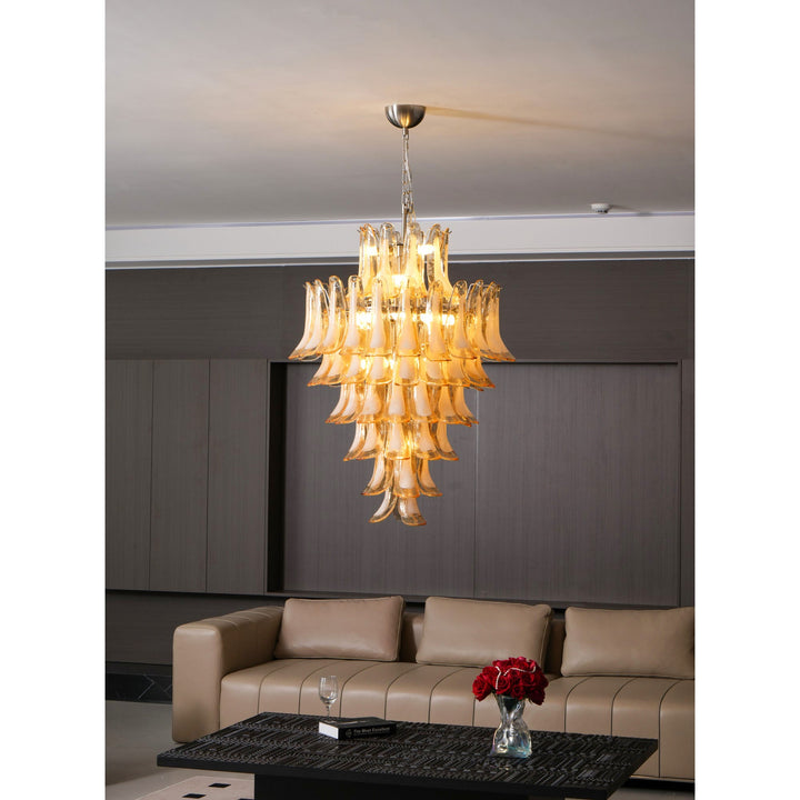 Enrich your surroundings with our Amber Murano Glass Petals Chandelier. Drawing inspiration from blossoming lotus petals, every component is skillfully crafted by hand in the Venetian style, emanating a cozy and opulent radiance. Ideal for sophisticated interiors, upscale dining, and exclusive hotels. Infuse any ambiance with timeless refinement.