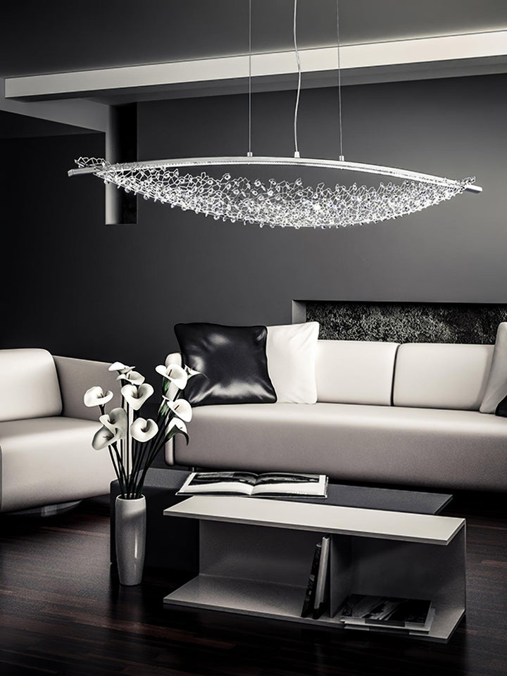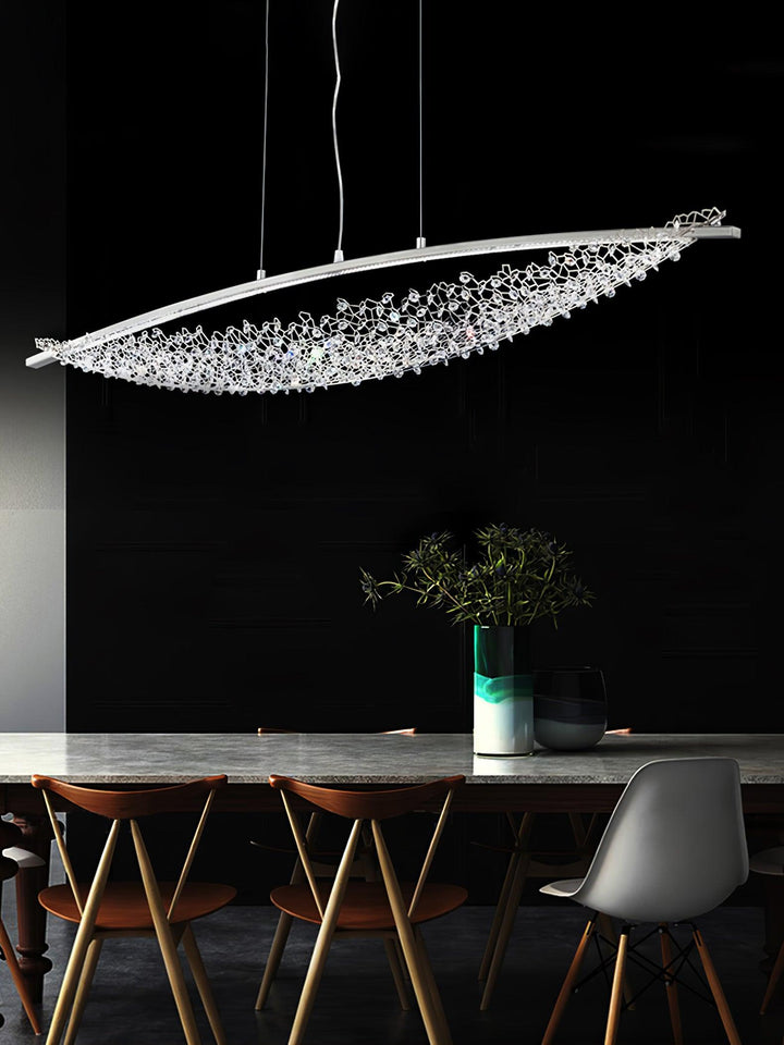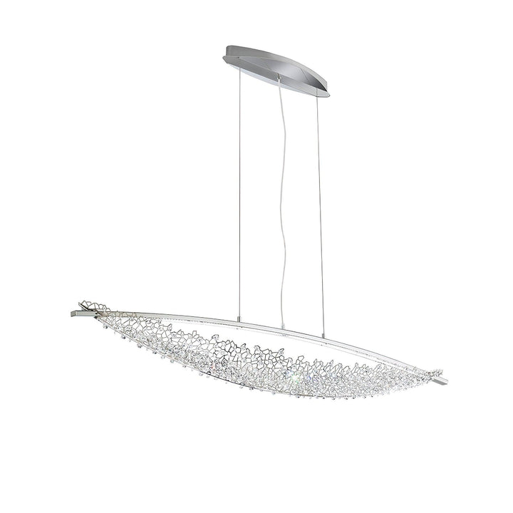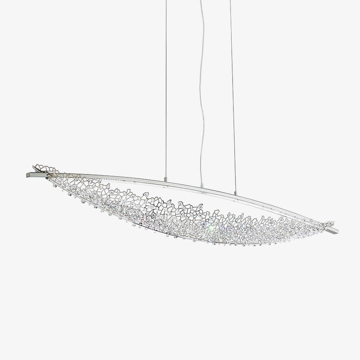 Transcend interiors with the majestic Amaca LED Linear Pendant Light, designed with an organically inspired netted veining of gleaming stainless steel and crystals. The draped steel blade pendant hangs from a slender light, which casts illumination through the glimmering crystal studs for a breathtaking modern silhouette and aesthetic.
