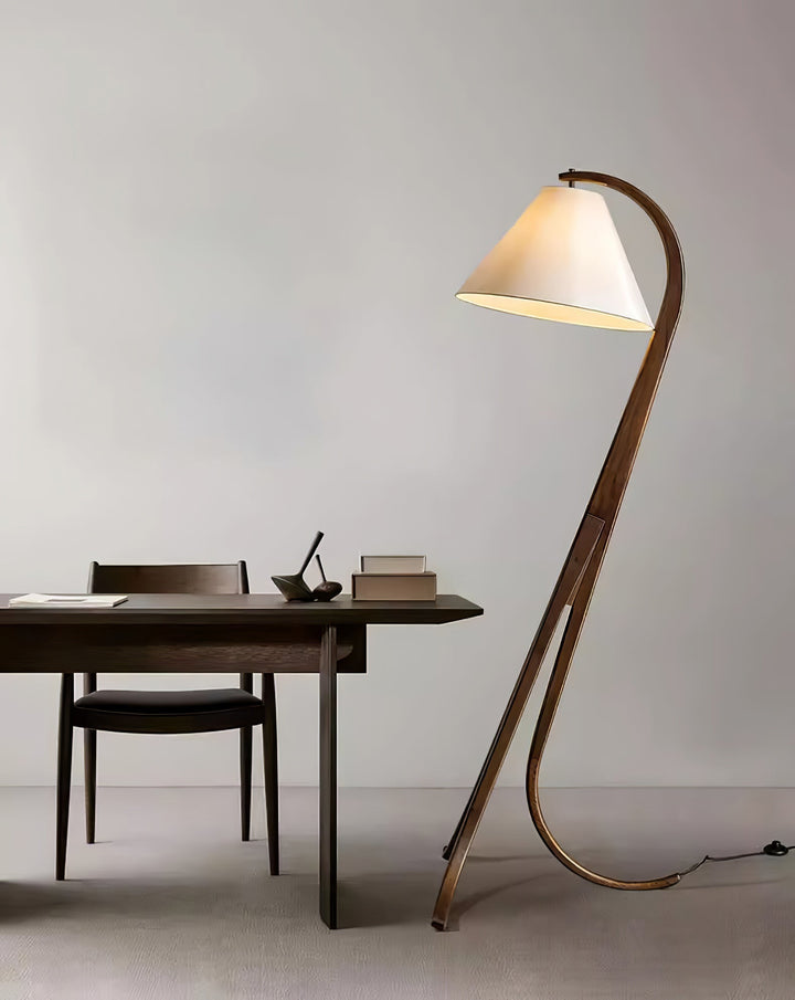 The Arcwood Floor Lamp features an elegantly curved wooden frame that exudes a sense of natural flow and modern sophistication. Its classic cone-shaped fabric lampshade diffuses a warm, ambient light, creating a cozy and serene atmosphere in any room. With its minimalist yet refined design, this lamp is not only a functional lighting piece but also a work of art. Perfect for living rooms, studies, or bedrooms, the Arcwood Floor Lamp enhances the decor while providing a soft, inviting glow.
