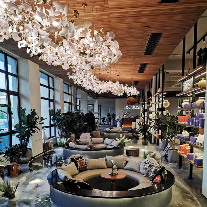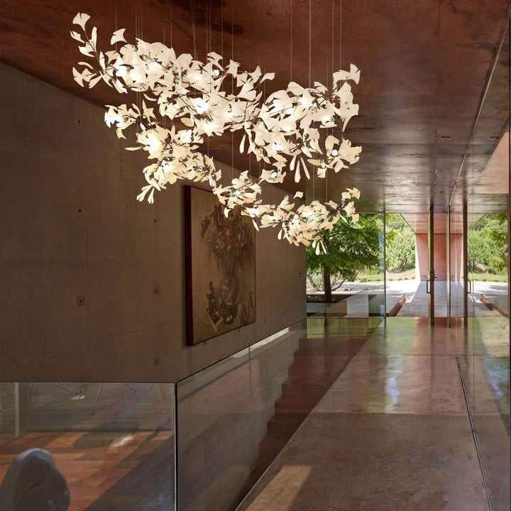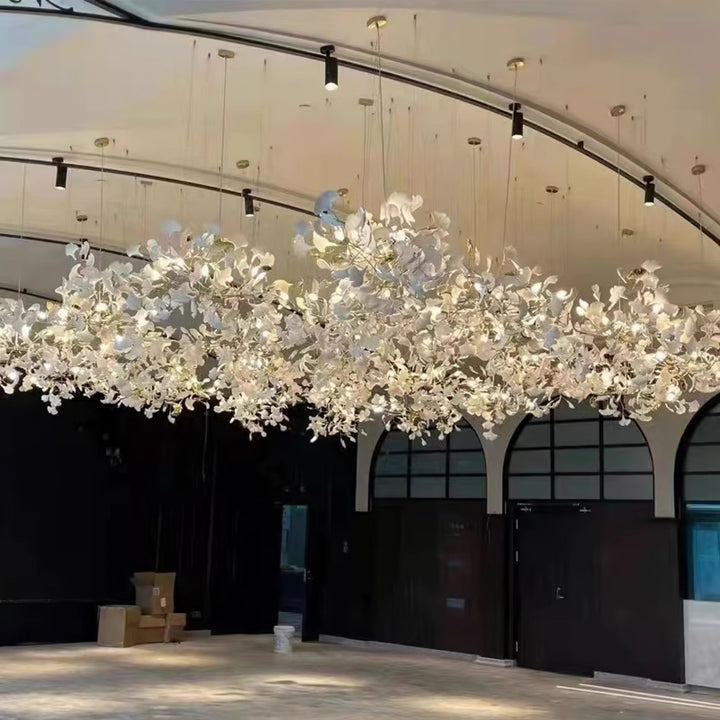 Featuring a luxurious overall design and advanced manufacturing technology, the Customize Gingko Chandelier showcases its opulence through exquisite ceramic petals adorning the metal lamp body. Immerse yourself in the perfect blend of lighting and nature with this bespoke installation, handcrafted with porcelain leaves. Experience the harmonious interplay of light and ceramic, creating a welcoming ambiance that promotes well-being. Beyond its functional purpose, this light sculpture defines its own striking appearance, eliciting awe as a mesmerizing piece of artwork. Like a living plant, it exudes a natural, dynamic energy that brings tranquility and vitality to any space. Working in tandem with the architectural and design vision, this installation is a symbol of harmony between man and nature.