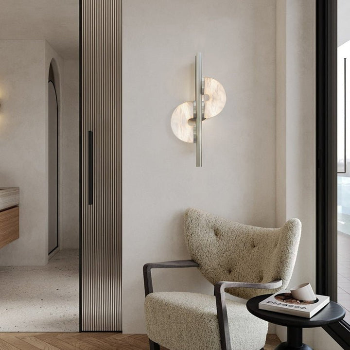 The Dolly Wall Lamp features a unique, double-disk design where two alabaster stones seem to float effortlessly, anchored in place by a sleek vertical metal bar. The alabaster, known for its natural veining and translucence, allows light to seep through, highlighting the stone's organic beauty and creating a soft, inviting atmosphere.