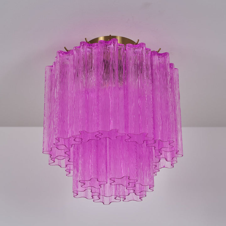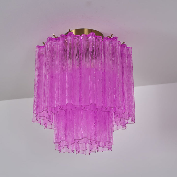 The Fiora Purple Glass Ceiling Lamp brings a bold splash of color and elegance to your ceiling. Featuring stunning layered pink glass panels that cascade gracefully, this fixture emits a soft, diffused light while adding a playful yet sophisticated touch to any room. The champagne gold base enhances the vibrant purple, creating a striking contrast that draws the eye. Perfect for bedrooms, living rooms, or even a modern dining space, the Fiora flush mount is designed to transform interiors with its unique blend of color, style, and light.