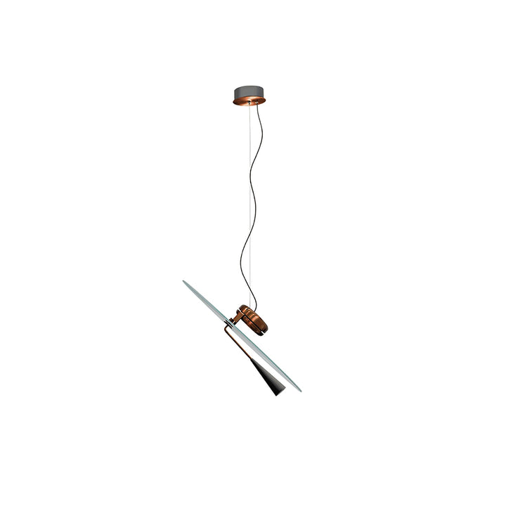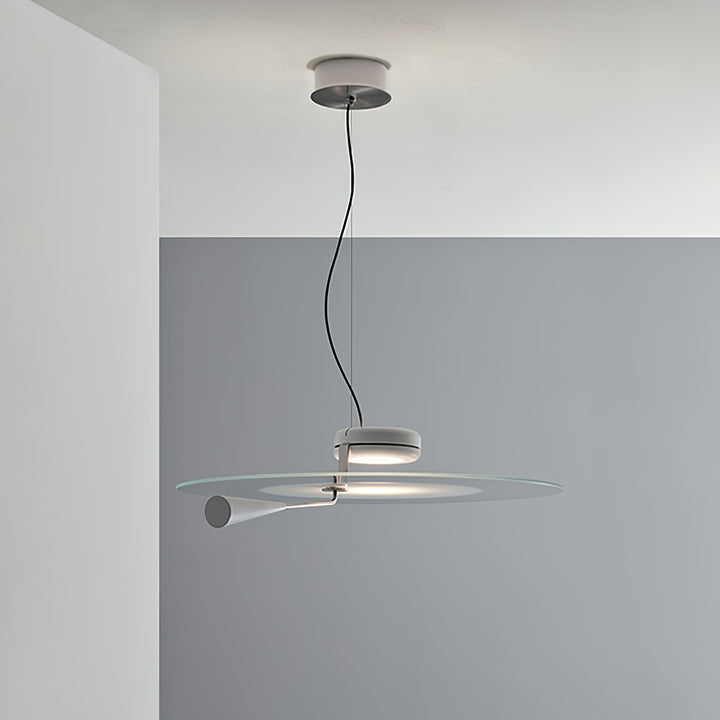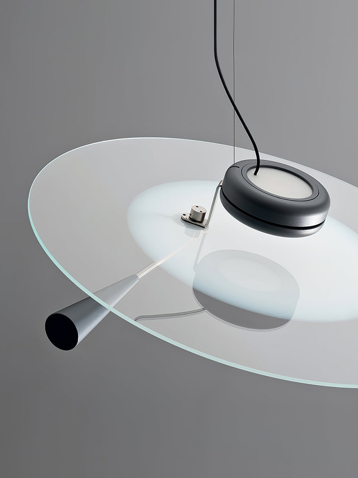 The Bascula Pendant Lamp takes inspiration from the iconic starship Enterprise, featuring a sleek disc suspended by a single cable. The conical counterweight not only balances the lamp, but also directs the light for optimal illumination. Experience modern design and efficient functionality with this unique piece.