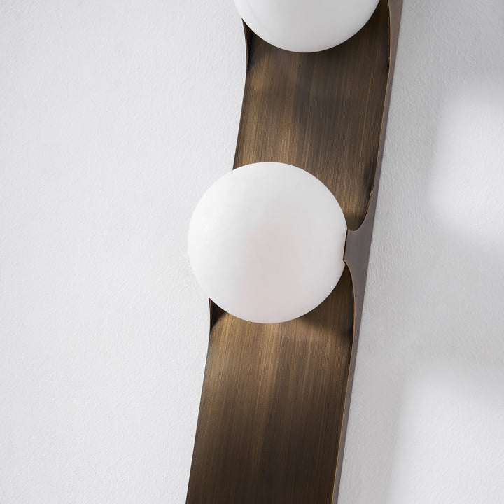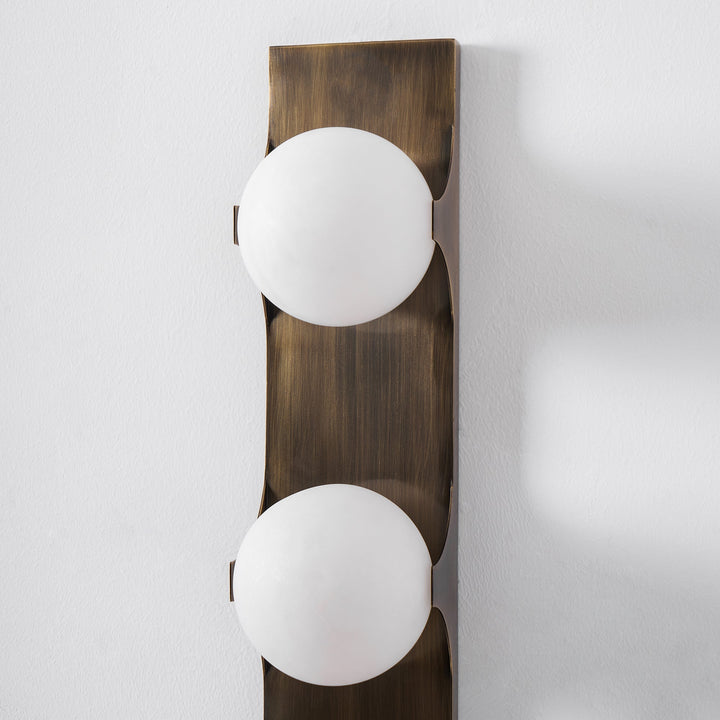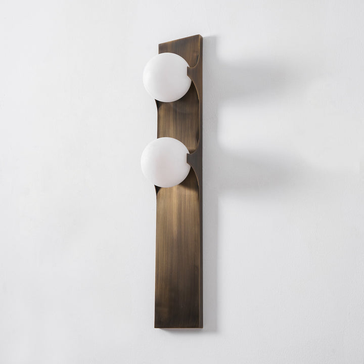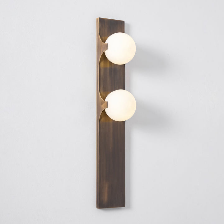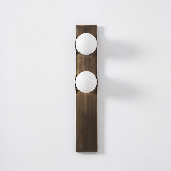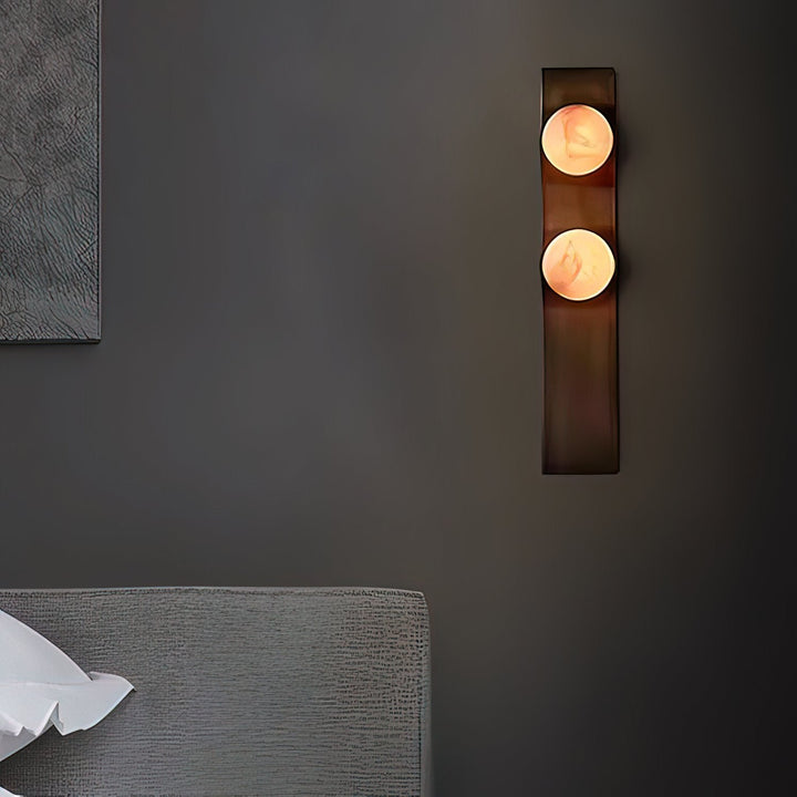 Introduce contemporary sophistication with the Geo-Lumen Bar Wall Sconce by Vakkerlight. This striking fixture features a sleek, vertical metallic bar in a rich, dark bronze or brushed brass finish, serving as a minimalist canvas for two exquisite circular light sources. Each disc is crafted from translucent Alabaster, showcasing unique natural veining that creates a warm, organic visual texture when illuminated. The light gently emanates from these stone circles, casting a soft, inviting glow upwards and downwards along the wall, while the robust linearity of the metal bar adds a clean, architectural element. Perfect for flanking doorways, adorning hallways, or adding an artistic touch to modern living spaces, the Geo-Lumen Bar exemplifies Vakkerlight's fusion of natural elegance and cutting-edge design.