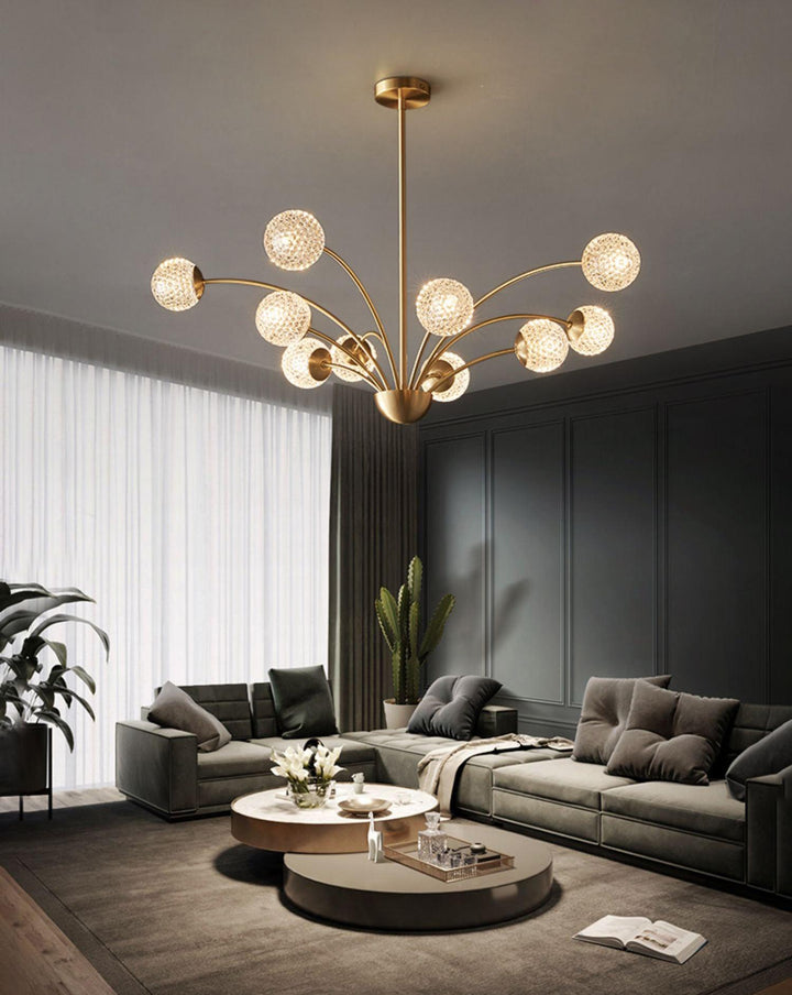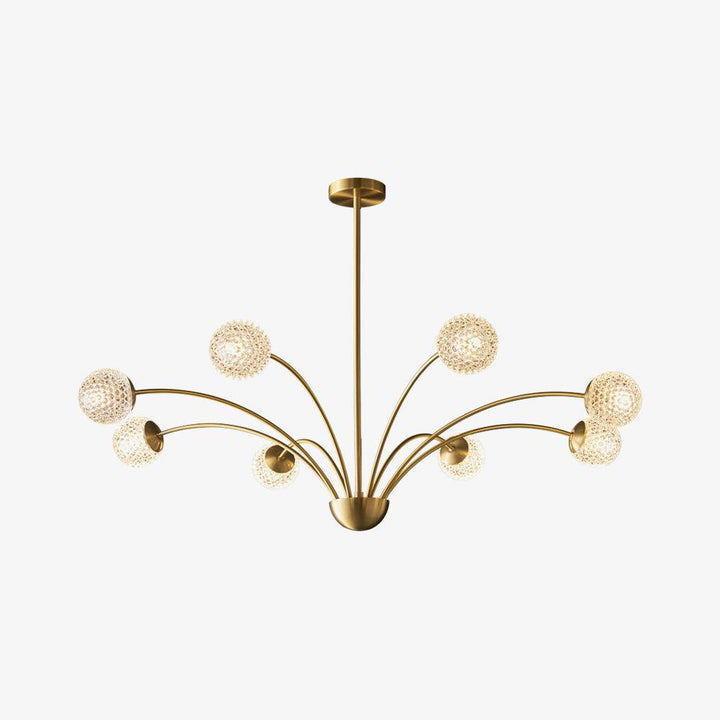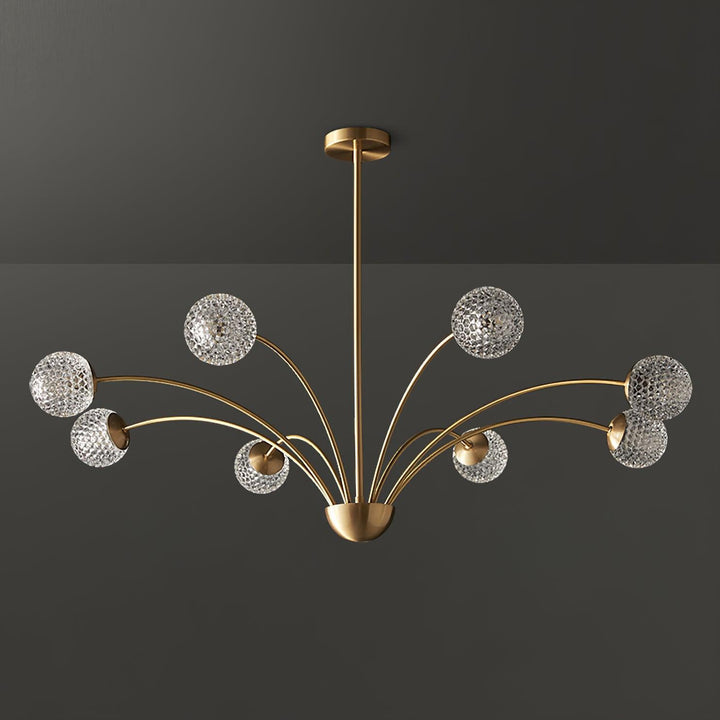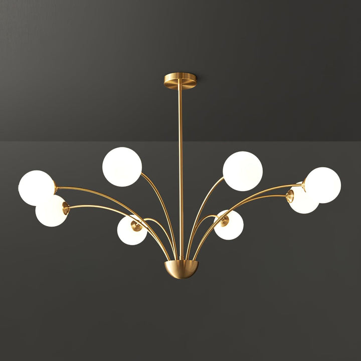 This Millender Chandelier is sure to make a statement above your living room. It showcases eight arms that in different directions. Each arm has a glass globe-shaped shade on the end that disperses soft and warm light. The opaque/white glass shades paired with the metal construction in gold finish create a modern and timeless atmosphere in your home.