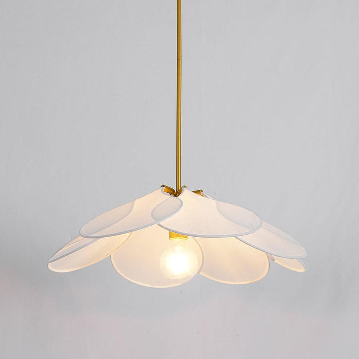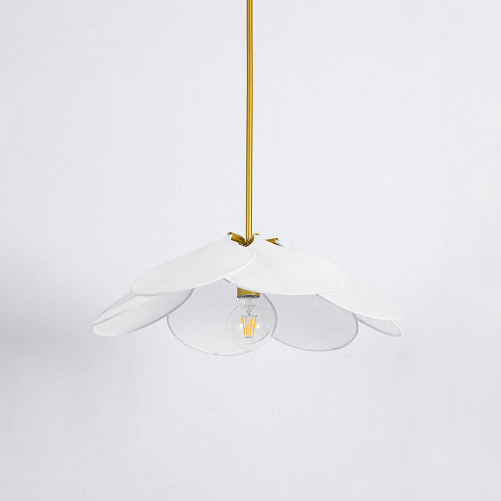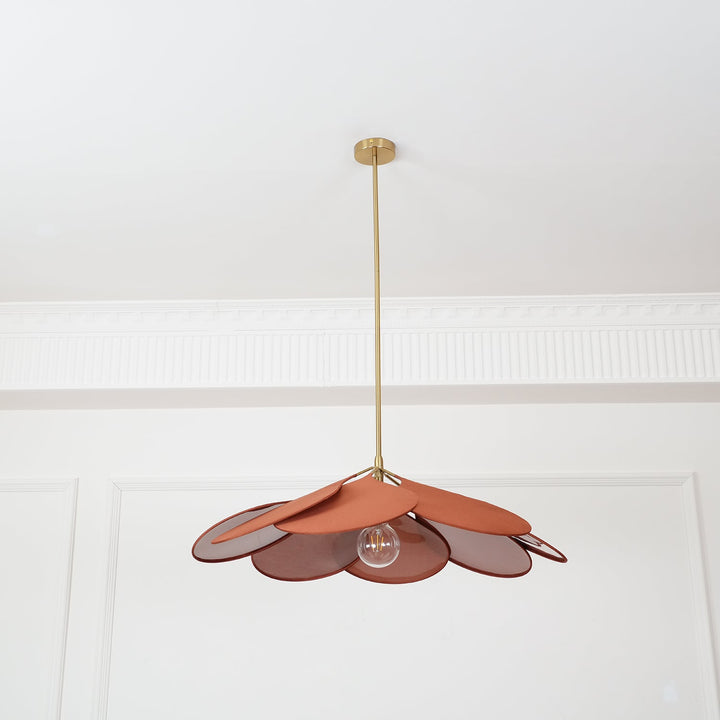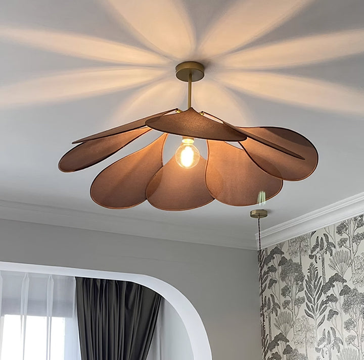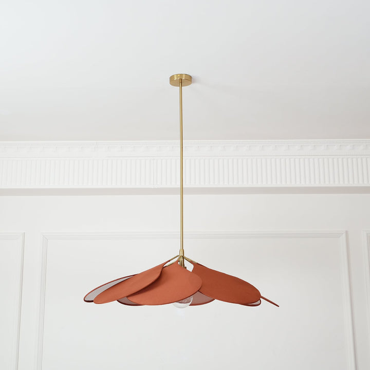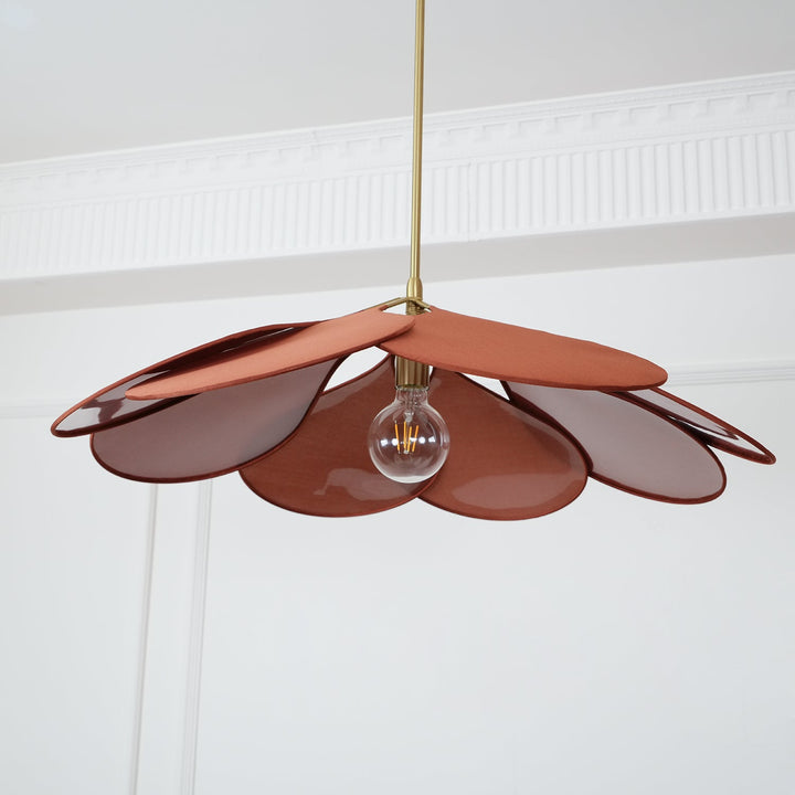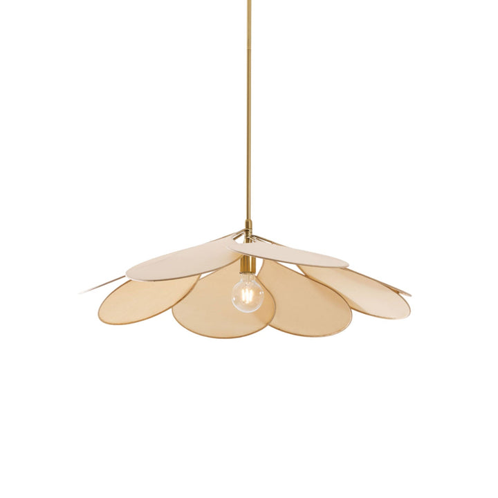 The unexpected combination of metal, and fabric in a floral and airy suspension. To the sleekness of a teardrop-shaped petal, the designer adds an homage to the retro ceiling fans of louvered bedrooms. This petal pendant plays subtly with light, diffusing a soft clarity in the room and delicate shadows on the ceiling.