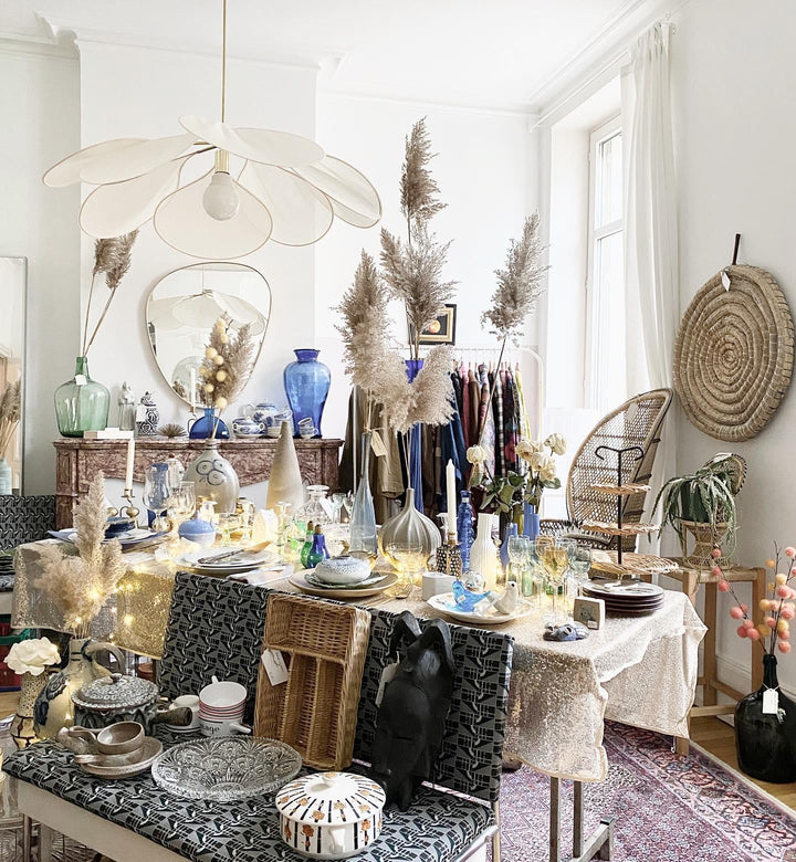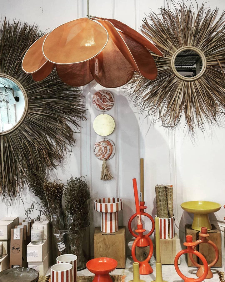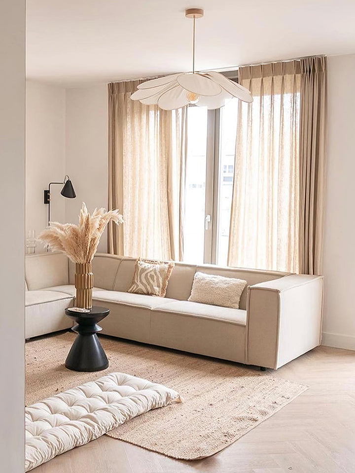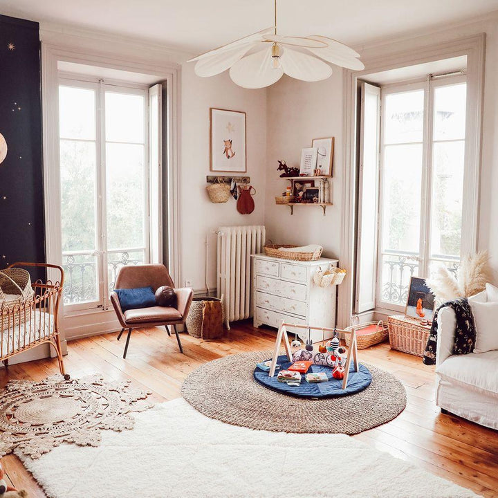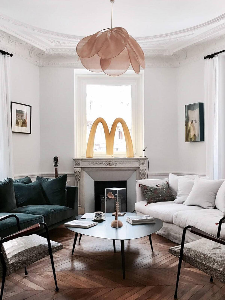 The unexpected combination of metal, and fabric in a floral and airy suspension. To the sleekness of a teardrop-shaped petal, the designer adds an homage to the retro ceiling fans of louvered bedrooms. This petal pendant plays subtly with light, diffusing a soft clarity in the room and delicate shadows on the ceiling.