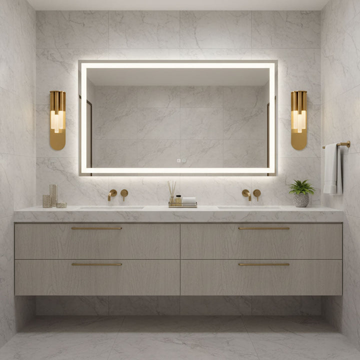 Introducing the Rousseau Wall Lamp. This modern luxury fixture features sleek brass accents and frosted glass tubes, creating a sophisticated and warm ambiance. With clean lines and high-quality materials, it is the perfect statement piece for upscale interiors. Upgrade your space with style and diffused lighting.
