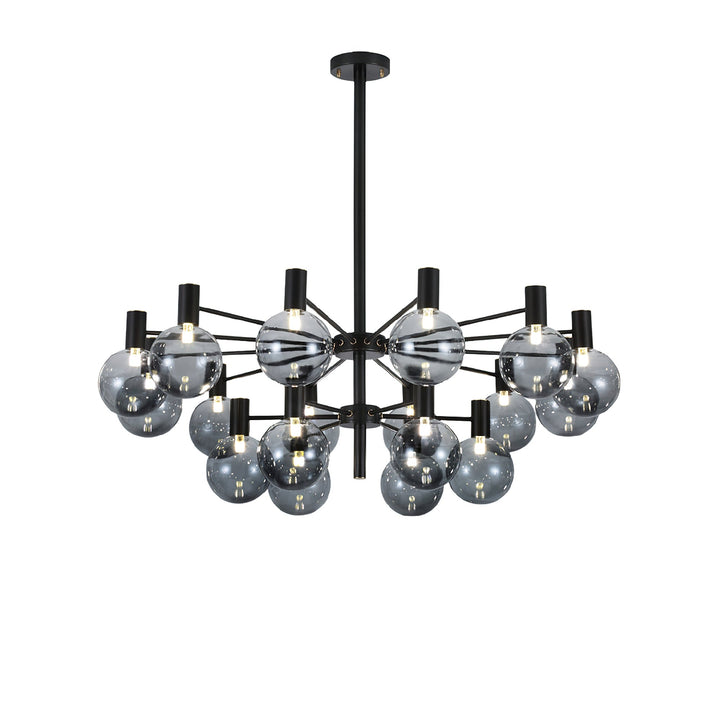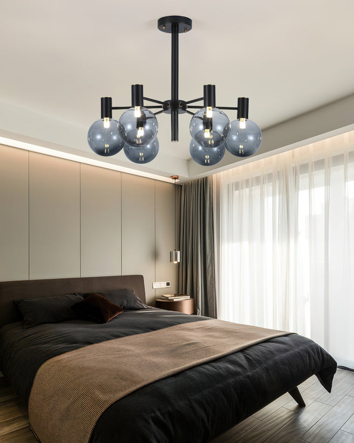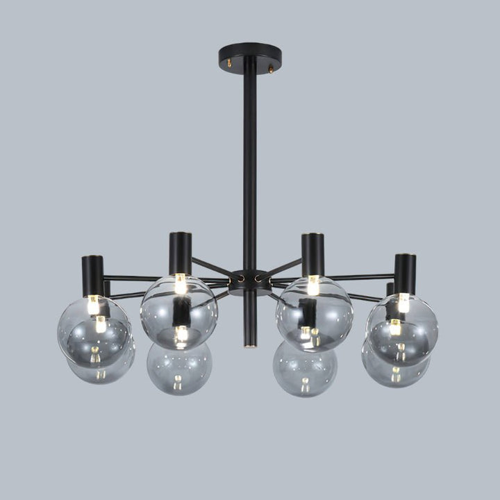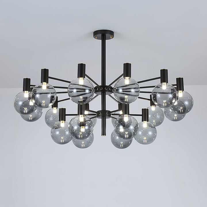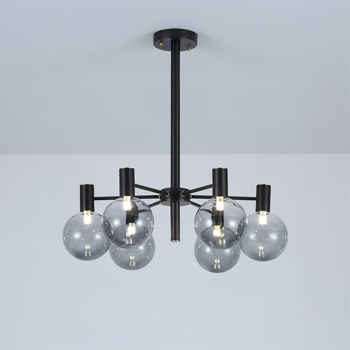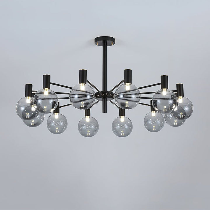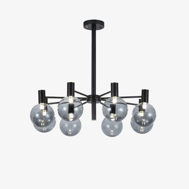 The Selva Black Chandelier is a modern take on mid-century design, featuring a sleek black frame supporting a smoky gray glass globe. This piece elegantly combines simplicity with drama, making it the perfect addition to any contemporary space looking for a blend of sophistication and minimalist style. The arrangement of the spherical lights ensures balanced lighting, perfect for creating a cozy atmosphere in the dining area or living room.
