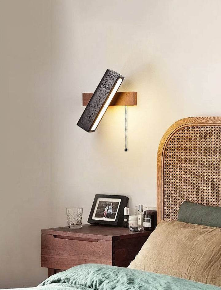 Discover dynamic illumination with the Stellar Pivot Sconce. This uniquely designed wall fixture blends rugged texture with refined warmth. The main light source is housed within a rectangular body, crafted from a "black hole stone"-inspired material, offering a deep, dark, and subtly textured finish that evokes cosmic mystery. This striking element is ingeniously mounted on a solid block of rich walnut wood, providing a beautiful natural contrast and anchoring the piece with earthy elegance. The light unit itself pivots, allowing you to direct the warm, linear LED glow exactly where needed. Complete with a stylish black pull-chain for easy operation, the Stellar Pivot Sconce is perfect for adding adjustable, modern sophistication and a touch of raw organic beauty to reading nooks, bedside lighting, or gallery walls.