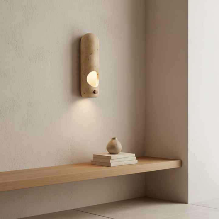 This wall sconce showcases a Travertine - style body with a natural, textured appearance. An oval - shaped cutout emits a warm glow, creating a cozy and inviting ambiance. Blending earthy, organic elements with functional lighting, it's perfect for adding a touch of understated elegance to interior walls.