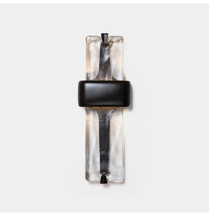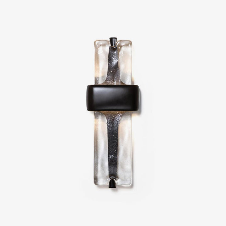 This modern take on a traditional torch, the wall lamp beautifully combines the boldness of black with the luminous clarity of glass. Surrounded by its sleek frame, the handcrafted glass is molded with elegant and gentle waves, providing a delicate touch to its cozy illumination. Discreetly embedded within the glass, the integrated LED emits a tranquil and welcoming radiance that bounces off the black surface.