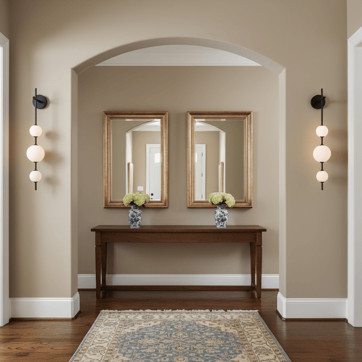 Add stylish lighting to any space with this Vertical Glass Globe Wall Lamp. This sconce makes a welcome addition to your indoor lighting. It features a fixed wall-mounted design with a metal body in a gold finish for a glam, minimalist look. The spherical glass shades in a matte white finish diffuse light with a warm, cozy glow, Just fix it in your bedroom, hallway, study or next to your bathroom mirror for effective lighting.