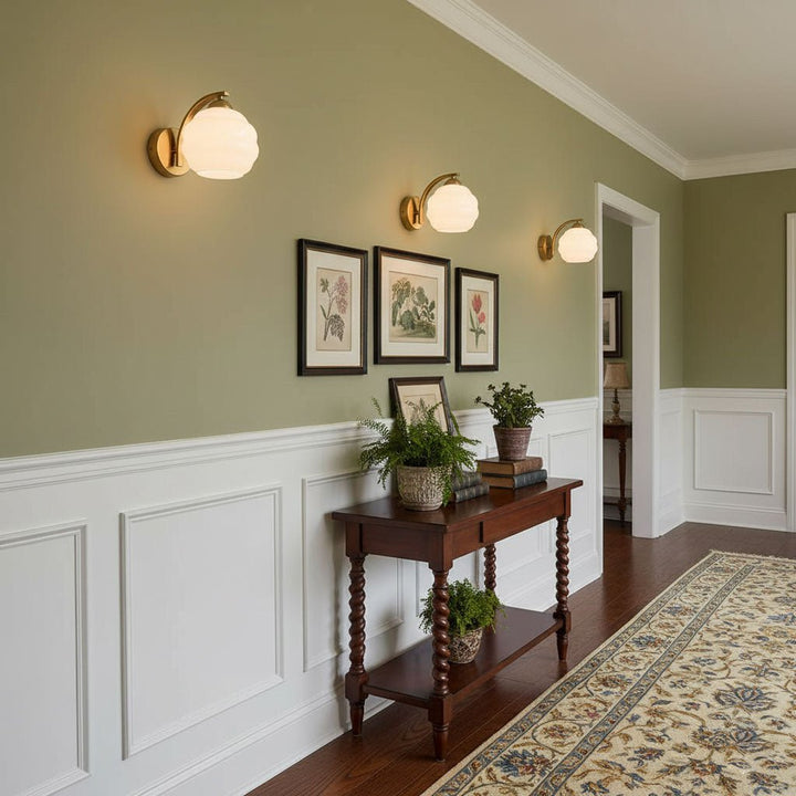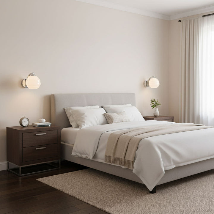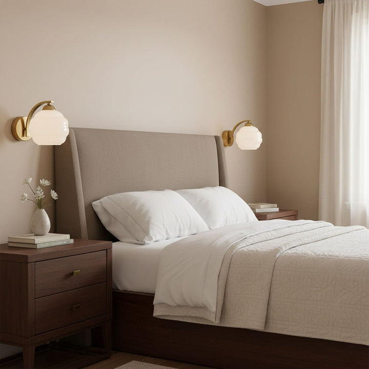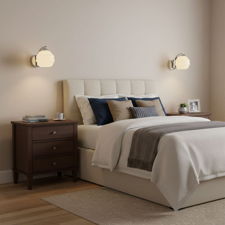 Quintessentially classic in form and finish, the Art Deco Vintage Wall Lamp easily makes an impression in both modern and traditional interiors. True to the timeless charm of the 1920s, its white glass shades feature classic curves and contours and produce a warm vintage ambience.  Available in gold or chrome construction.