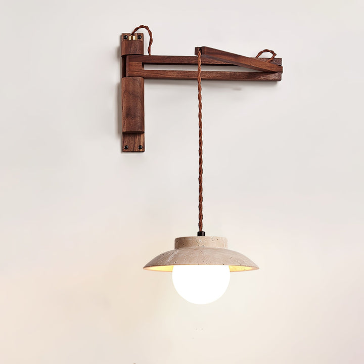 Introduce rustic charm and directional light with the Vakkerlight Artisan Arc Wall Lamp. This unique fixture features a rich walnut wood arm with a subtle curve, mounted on a coordinating backplate. A textured, stone-like conical shade is suspended by a stylish braided cord, holding an exposed bulb for warm, downward illumination. The lamp's thoughtful design, blending natural wood and textured materials, makes it a perfect, functional accent for reading nooks or bedside lighting in modern farmhouse and craftsman interiors.
