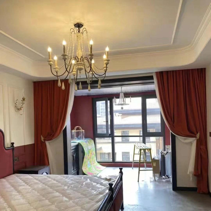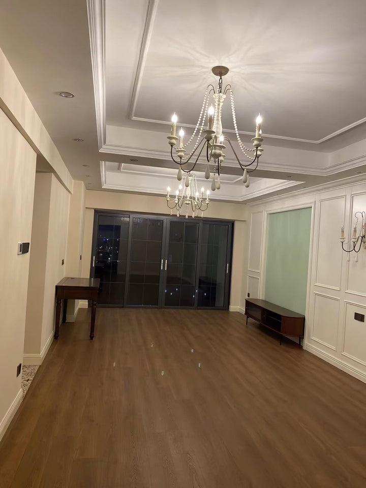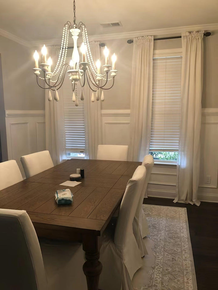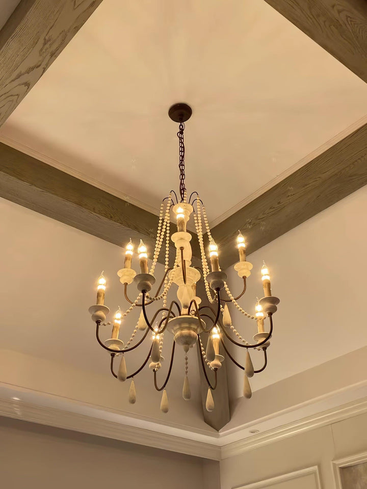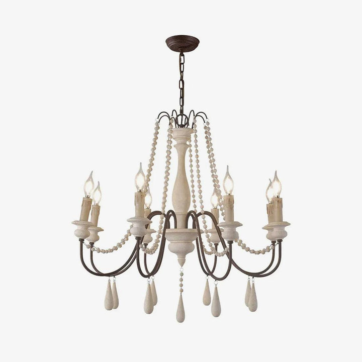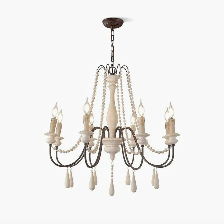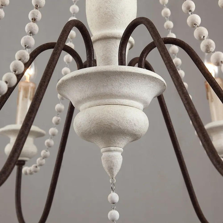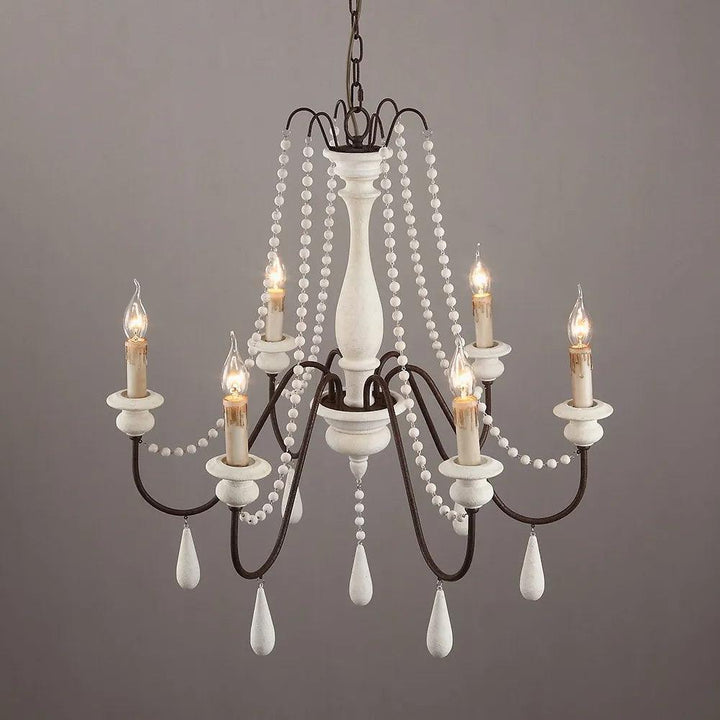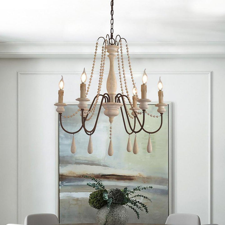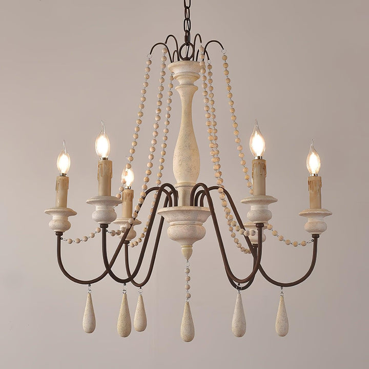 Dress up your home with this graceful wooden bead swag chandelier. Wooden bead strands swag and drape elegantly scrolling arms to give a timeless, elegant boost. Dangling teardrop ornaments echo the theme and draw the look together. Heavy metal in rust and distressed wood make a comfortable contrast. A coat of distressed white finish complements any home decor with a soft, feminine touch.