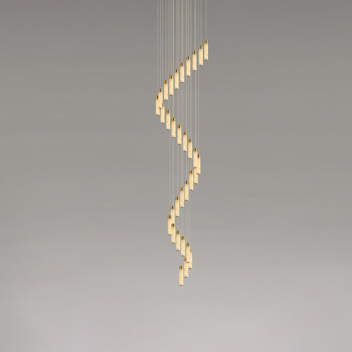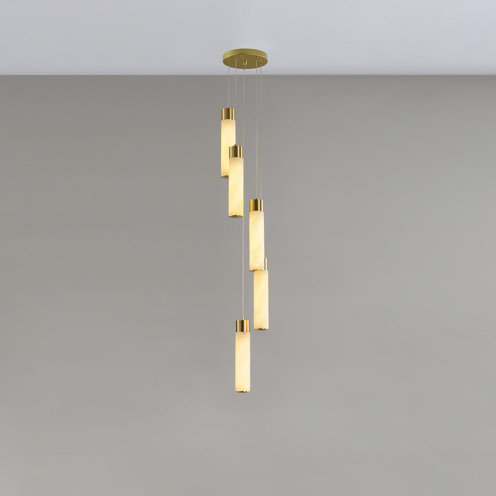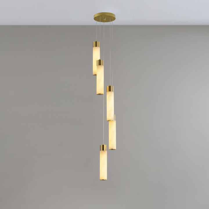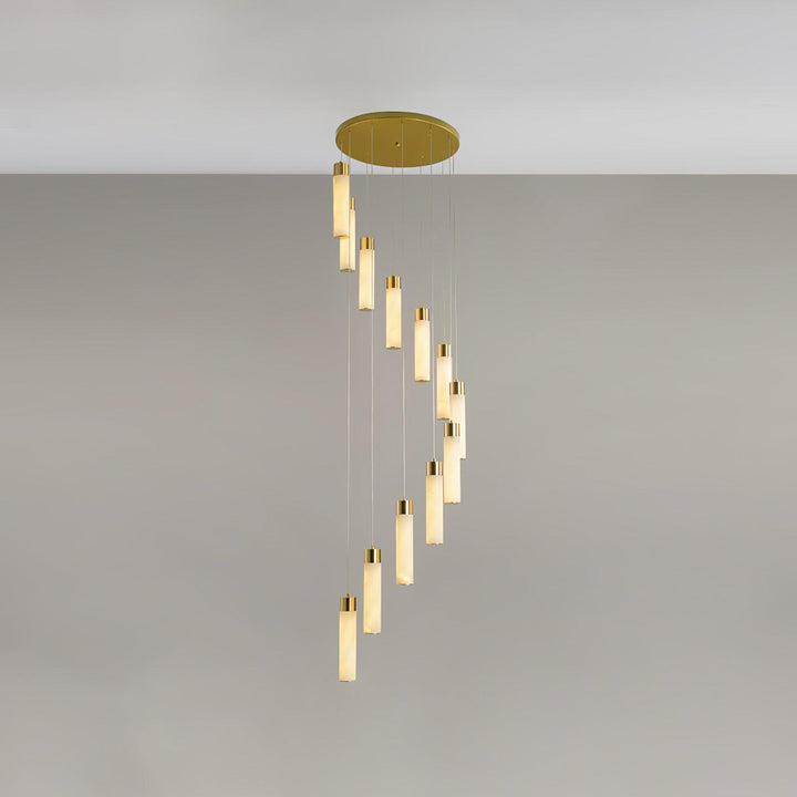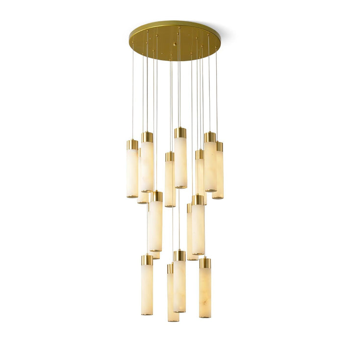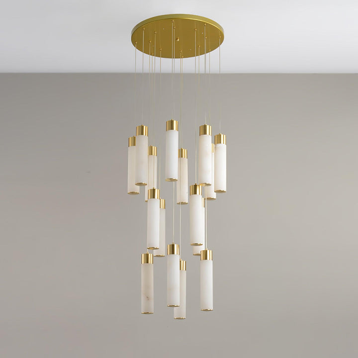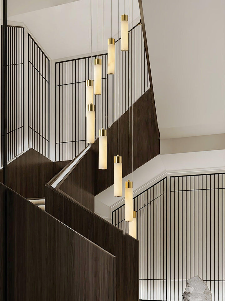 The Celestial Alabaster Cascade Chandelier is a symphony of light, form, and exquisite materials, designed to add an air of sophistication to any space. This chandelier features an array of cylindrical alabaster shades suspended at varying heights, each emitting a soft, natural glow that highlights the unique veining and translucent quality of the stone.