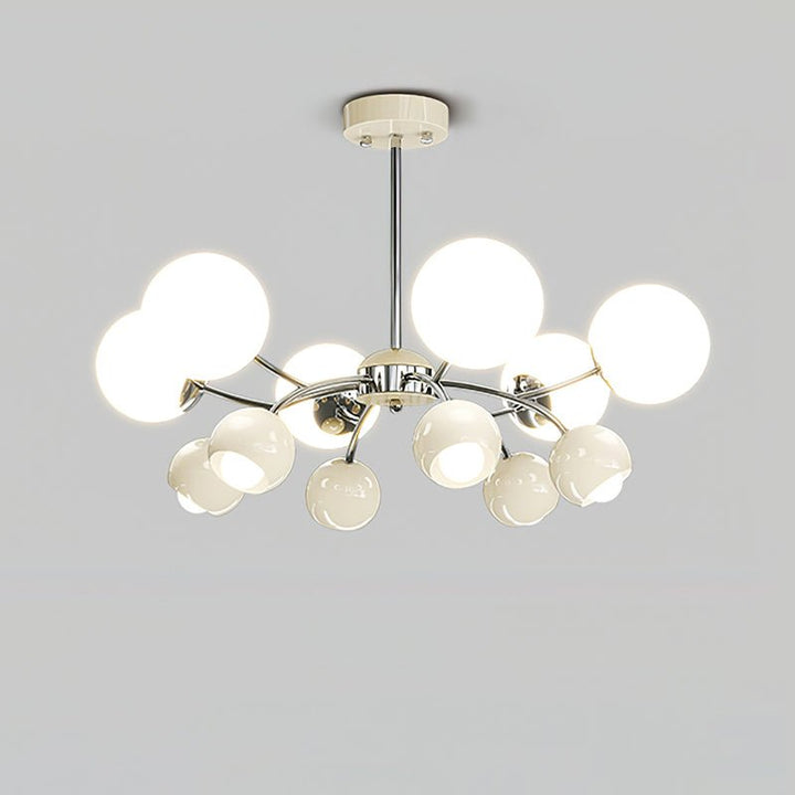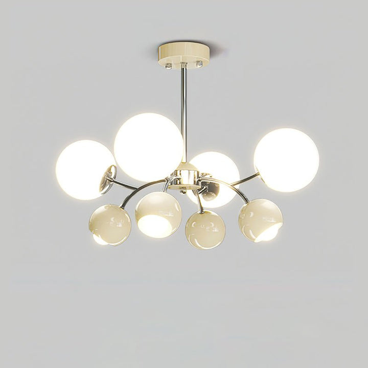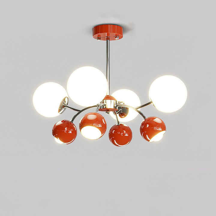 The Celestial Sphere Chandelier captures the whimsical nature of the starry sky. Featuring a series of spheres harmoniously blended in glossy white and vibrant red, this lighting fixture is designed to add a touch of color and playful rhythm to any space. The spherical shape and shiny chrome finish reflect the modern style of the mid-century aesthetic, making it an eye-catching centerpiece that complements both modern and vintage decor. This chandelier is perfect for igniting a sense of wonder and creativity above your living room or dining area.