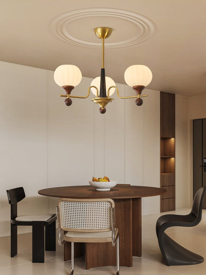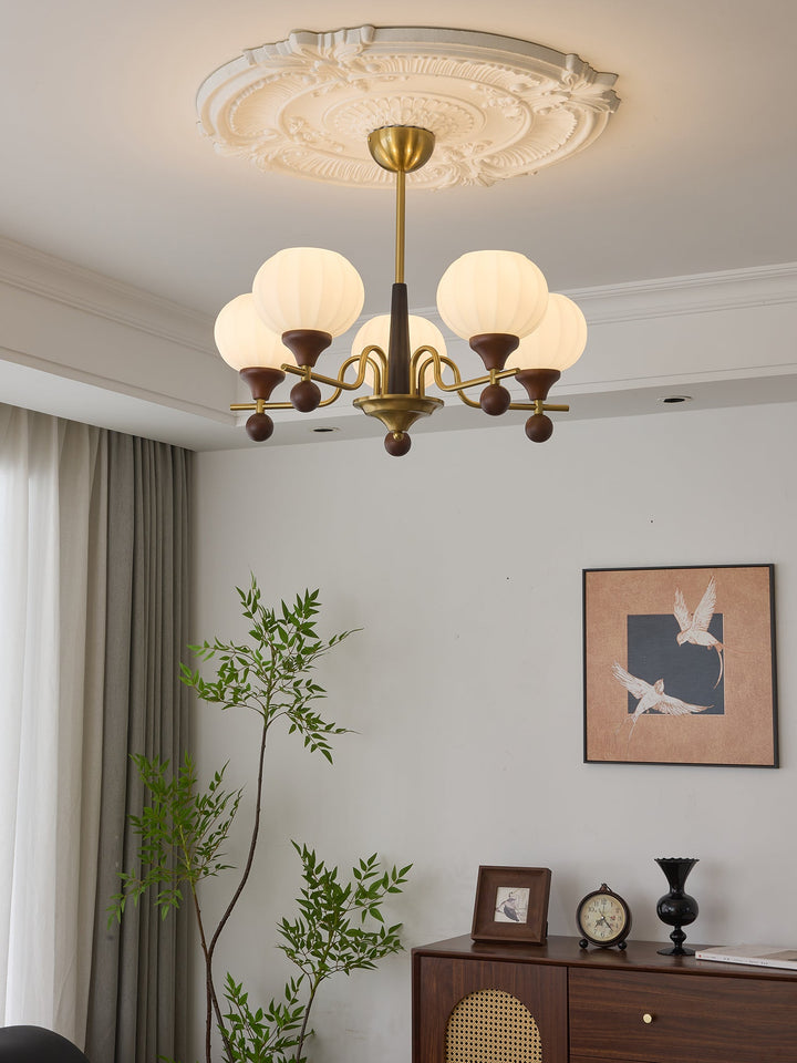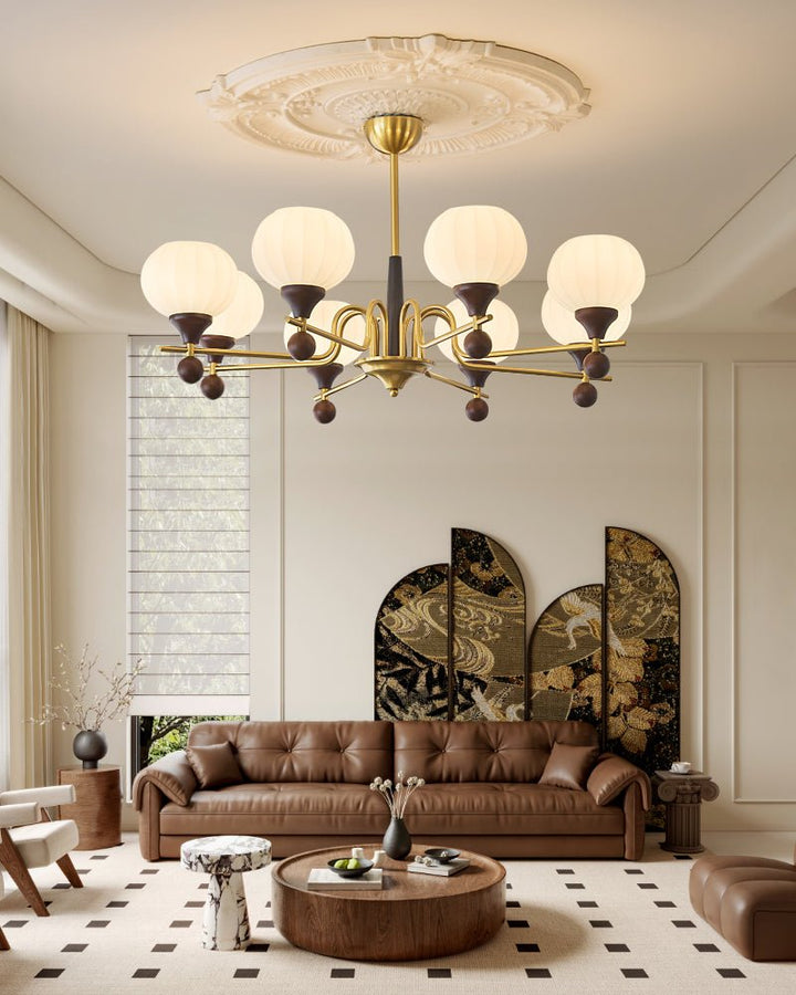 The Ceylian Chandelier embodies a seamless fusion of iron, wood, and frosted glass, creating an exquisite balance of warmth and elegance. Its graceful brass framework is adorned with rich wooden accents, lending a timeless charm that complements both classic and modern interiors. The delicately ribbed glass shades cast a soft, diffused glow, enhancing the ambiance of any space. Perfect for dining rooms, living areas, or high-ceiling foyers, the Ceylian Chandelier stands as a refined statement piece that exudes both sophistication and warmth.
