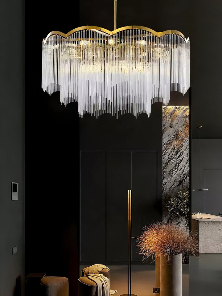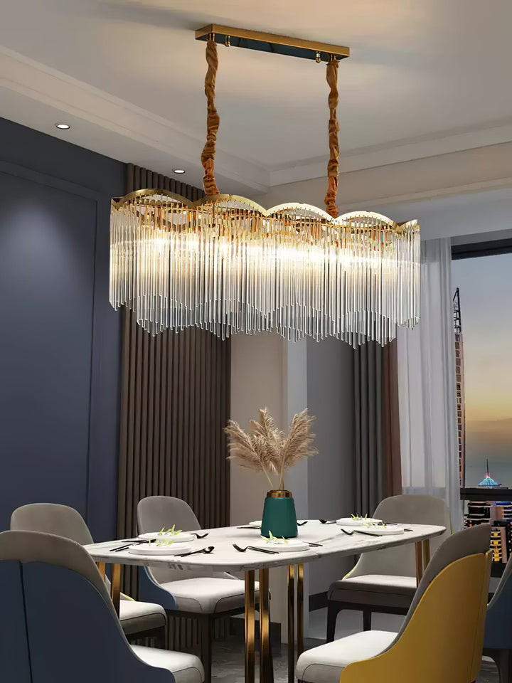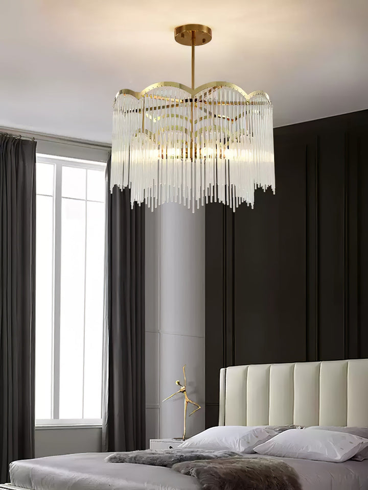 The pendant lamp uses a transparent glass rod pendant and an all-copper lamp stand to outline a minimalist wavy shape, which looks dreamy and romantic.