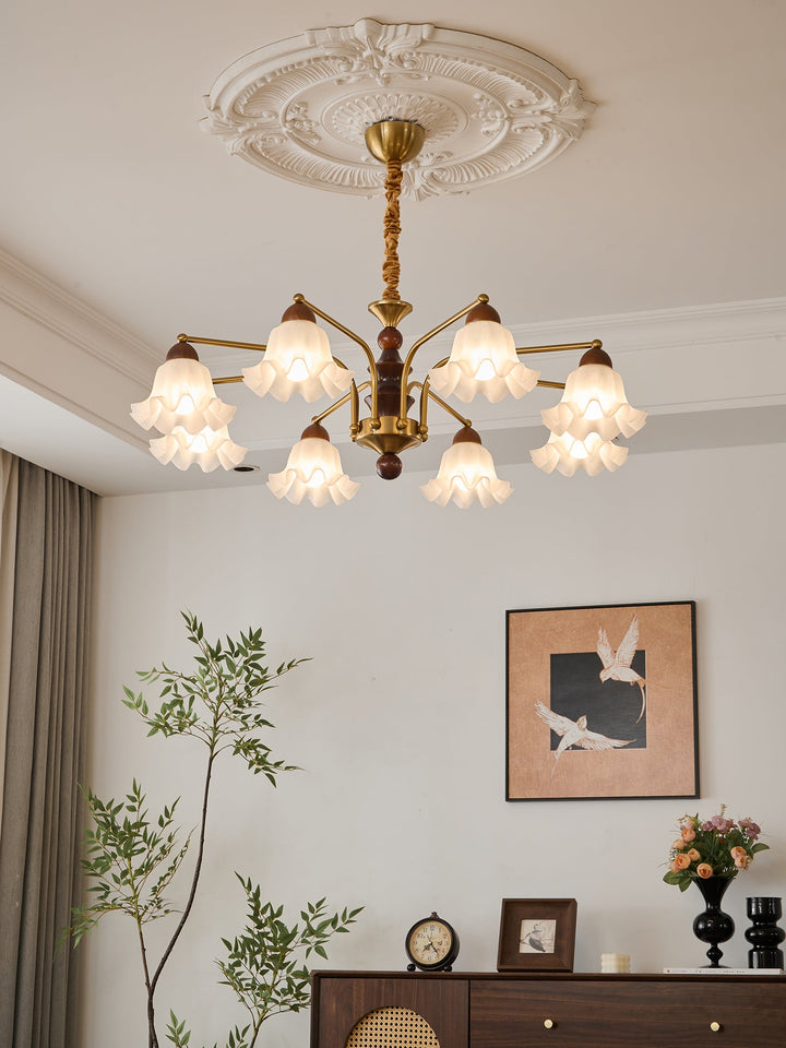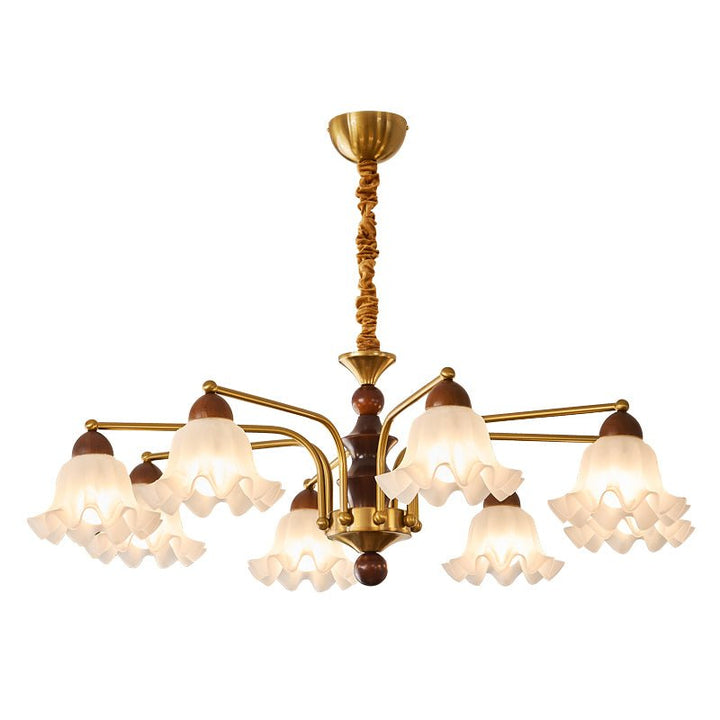 Illuminate your home with the stunning Dioris Chandelier from Vakkerlight. This exquisite piece combines iron, glass, and wood, offering a harmonious blend of rustic charm and modern elegance. Featuring beautifully crafted ruffled glass shades, each shade provides a soft, diffused glow, making it the perfect addition to any living room, dining space, or foyer. The rich wooden accents paired with the golden metal structure create a warm and welcoming atmosphere, adding sophistication to your home. The Dioris Chandelier is designed to bring timeless beauty and a touch of luxury to your interiors.