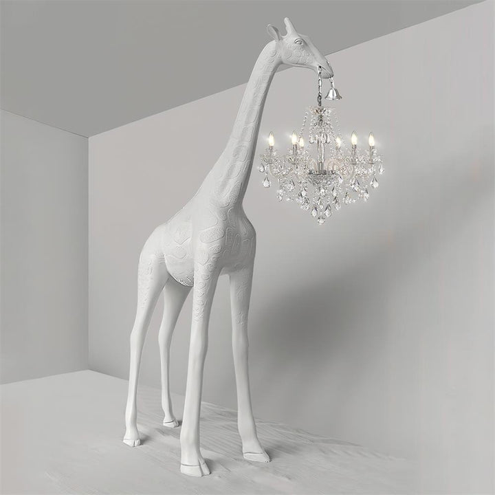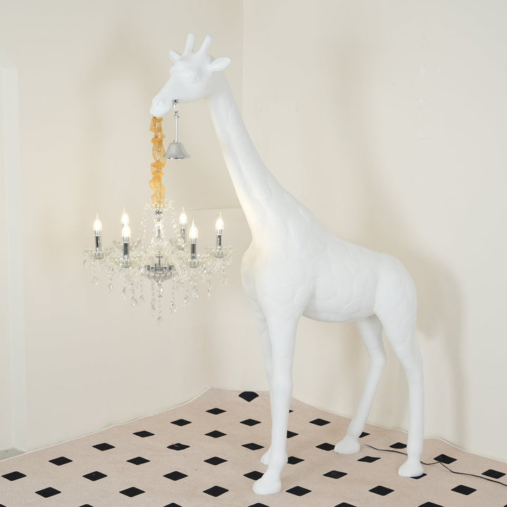 Indulge in the ultimate blend of art and light with the Giraffe Sculpture Floor Lamp, only at vakkerlight. Marvel at the pristine white giraffe, gracefully displaying a luxurious chandelier in its mouth. The intricate crystals and warm candlelight create an ambiance of opulence, elevating any space into a refined exhibit.