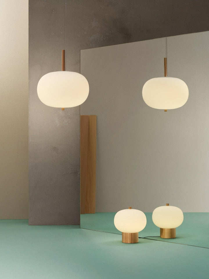 Ilargi lamp takes shape in a subtle and minimalist piece where a wooden wand sits between traditionally hand-blown glass spheres.Its warm, timeless design provides soft, pleasant light that adapts to professional and domestic settings, creating comfortable, natural spaces.