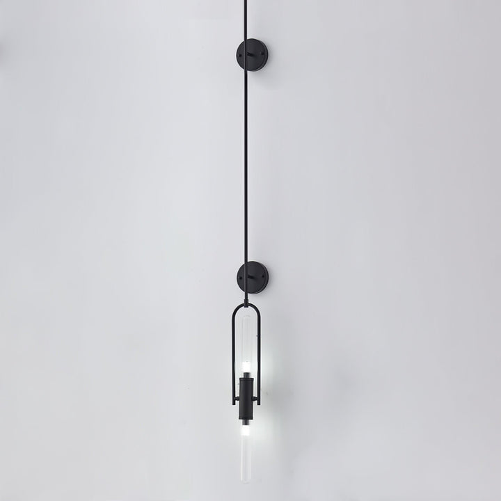 The body of the sconce displays a bold, arching silhouette that cradles a cylindrical glass lampshade. This elegant glass element acts as a tranquil vessel for the light, diffusing it into a warm, inviting ambiance that can transform any room.