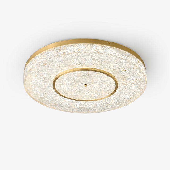 The Vakkerlight Mysterious Circle Ceiling Lamp showcases a unique blend of brass and resin, featuring a cracked glass or crystal-like appearance. Its central ring-shaped light source and surrounding layered rings emit a sophisticated and elegant glow, enhancing the aesthetic appeal of modern interiors.