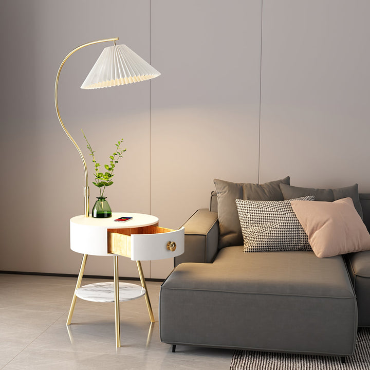 Elevate your space with our Pleated Nightstand Floor Light, a fusion of form and function. The opulent gold base and chic beige shade exude modern luxury, while the faux marble tabletop and storage shelf add practicality. Illuminate and decorate with style and sophistication.
