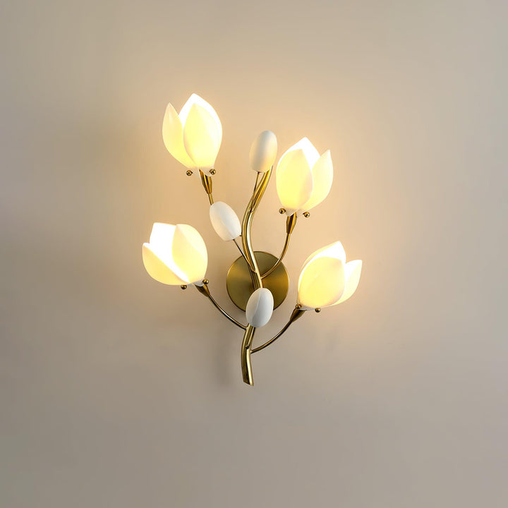 The White Porcelain Magnolia Wall Lamp is a tribute to the timeless elegance of nature's artistry. Carefully crafted from the finest white porcelain, each bloom of this lamp radiates a serene glow, while the metal branches, forged with precision, create an enchanting play of strength and delicacy.