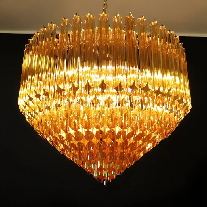The Vakkerlight Prism Murano Glass Chandelier features hand-blown Murano glass, with sharp, angular prisms that reflect and refract light in a stunning array of patterns. Its captivating design brings a luxurious, art-deco touch to any room. Perfect for grand dining rooms, modern living spaces, or luxury hotels, this chandelier combines the timeless elegance of Murano craftsmanship with a modern aesthetic. The delicate glass pieces create an inviting glow, adding sophistication and glamour to your interior with every shimmer.