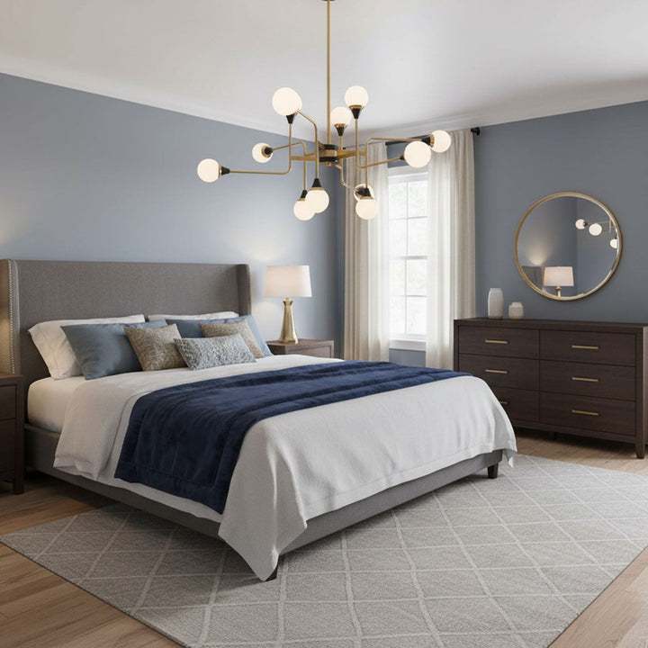 An asymmetrically shaped chandelier composed of six bent brass arms with black enamel details in the style of Stilnovo mid-century. 12 blown white glass globes.
