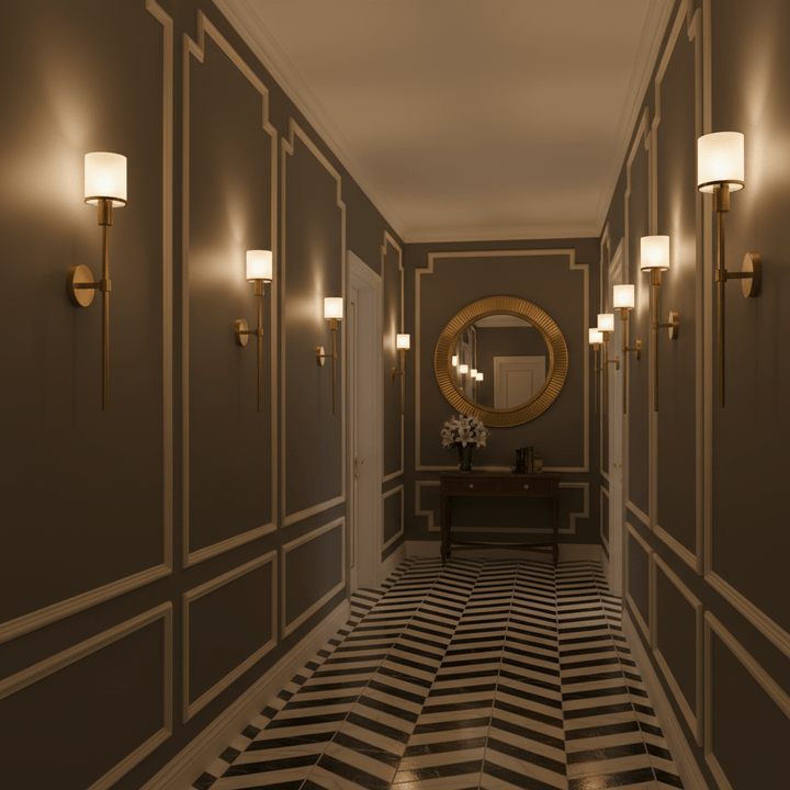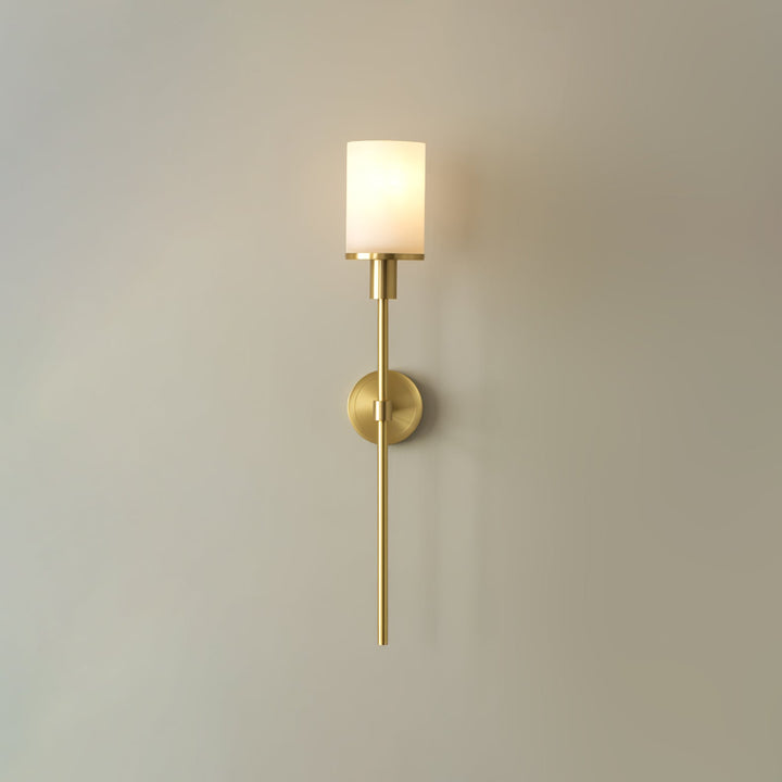 The Tracie Classic Sconce features a transitional glass and metal design, perfect for both office and bathroom installations. Its cylindrical shade, paired with various metal finishes, provides a soft diffused light, creating a serene atmosphere. With a moisture-resistant rating, it is ideal for dual placement on either side of a bathroom vanity.