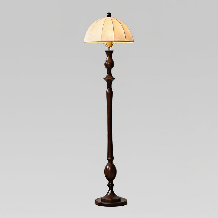 The Windsor Vintage Floor Lamp evokes a sense of timeless elegance with its slender, sculpted wooden base, which rises gracefully to support a classic dome-shaped fabric shade. The rich, dark finish of the wood contrasts beautifully with the soft, warm light emitted through the shade, creating an inviting and cozy atmosphere. This floor lamp is reminiscent of traditional British design, blending antique aesthetics with modern functionality, perfect for adding a touch of old-world charm to any living space.