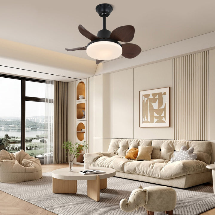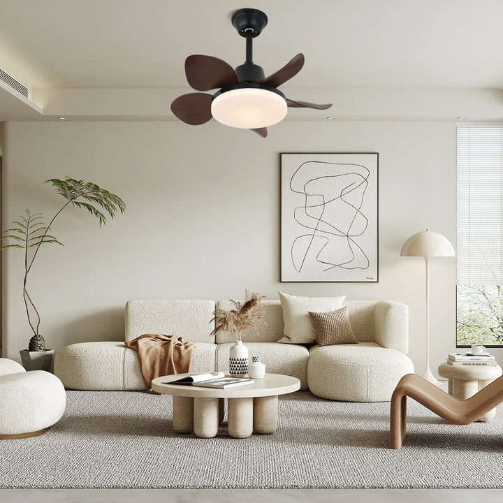 The Amelia Ceiling Fan Light by Vakkerlight exudes charm with its petal-shaped wooden blades and soft, diffused light. A perfect blend of elegance and efficiency.