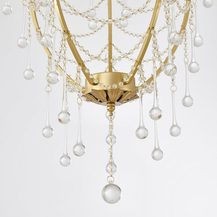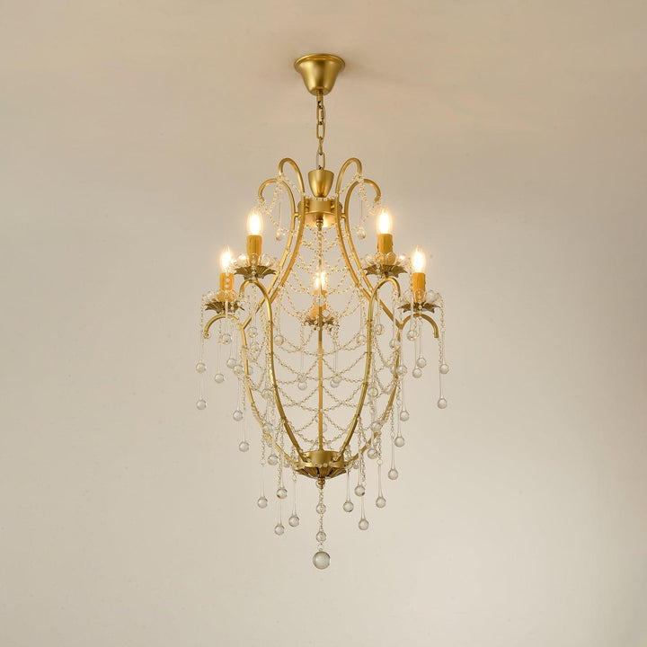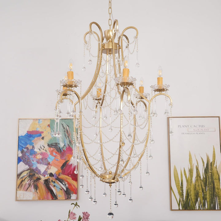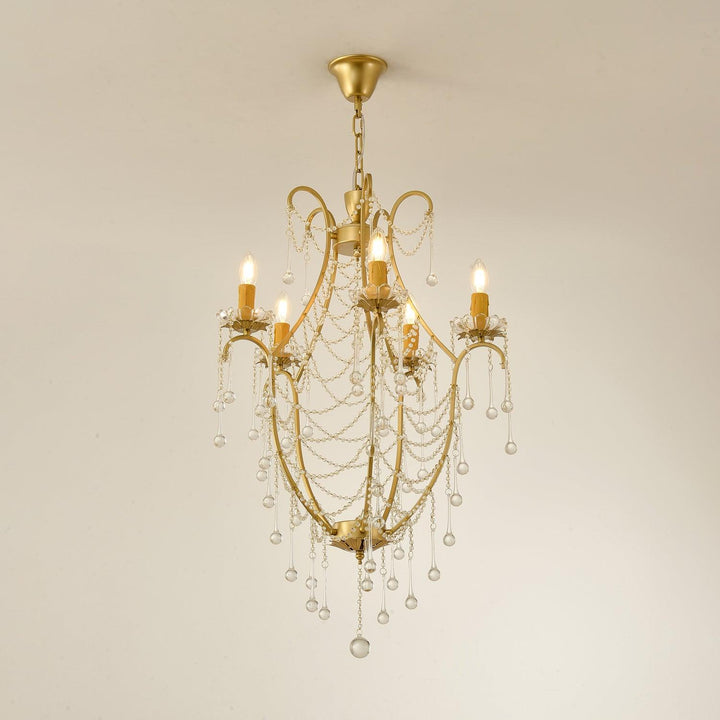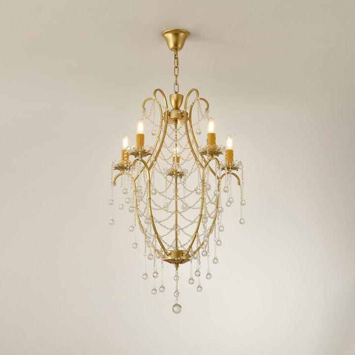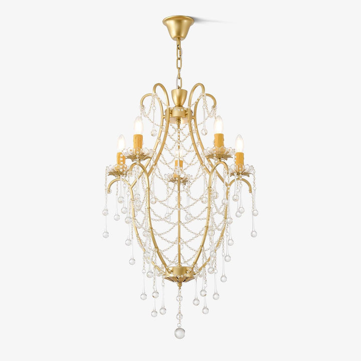 This magnificent Birdcage Chandelier brings an elegant touch to any space. Handcrafted with a unique birdcage structure and five lights complemented by a generous serving of glass chains and beautiful glass drops, it is a Chinese-made piece custom-made for you. Finished with a carefully hand-painted vintage gold finish, it is adorned with transparent glass accents and lavish crystal glass drops.