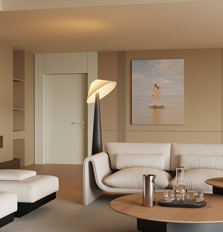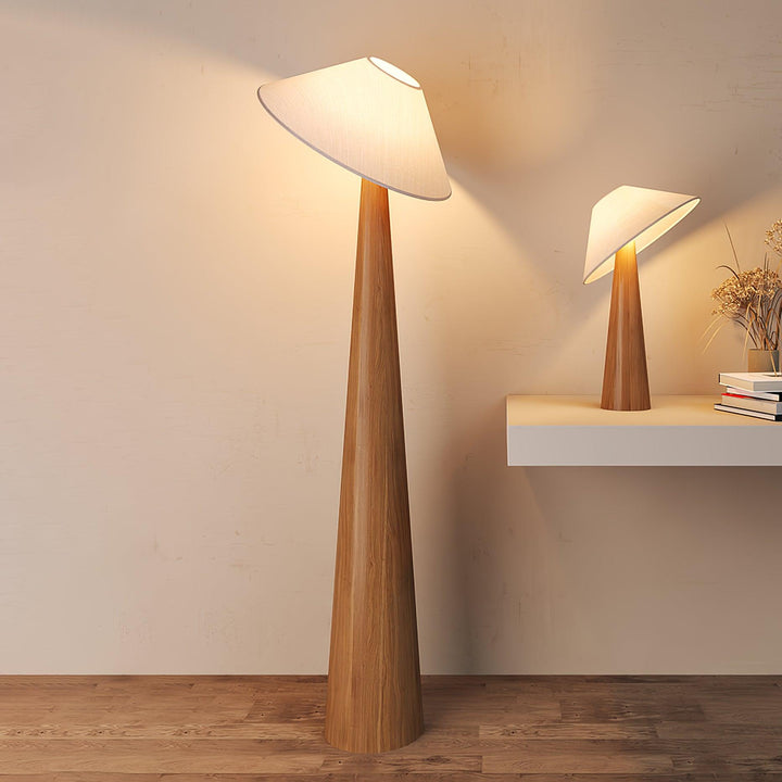 This lamp features a solid wooden base that ascends in a sleek, conical form, emphasizing the wood's natural beauty and texture. At its zenith, a gently tilted metal arm cradles a triangular fabric shade, reminiscent of a canopy leaf floating gracefully in the forest. The soft light that filters through the fabric shade provides a warm, ambient glow, perfect for creating a cozy atmosphere in any room. The fusion of metal's modern edge with the organic feel of wood and the softness of the fabric makes the Tilt Hat Wooden Floor Lamp a versatile addition to a variety of decor styles, from Scandi-chic to mid-century modern, and a striking piece that draws the eye with its elegant poise and innovative design.