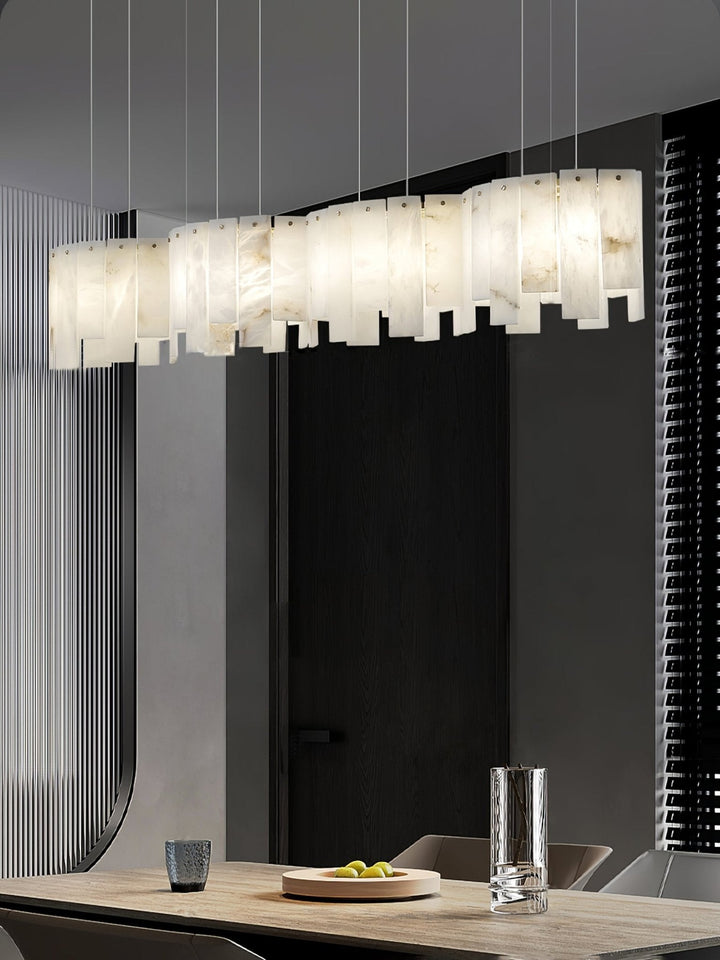 The Arctora Pendant captures the allure of glacial forms and sculptural rhythm. Its staggered alabaster panels echo the jagged contours of icebergs adrift, while the warm internal glow softens their edges like northern twilight. Suspended with minimalist cables, this statement piece blends natural stone with architectural harmony—perfect for dining rooms or grand contemporary spaces.