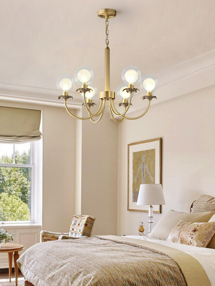 The Aureate Radiance Glass Chandelier is the epitome of luxury and art, designed to elevate any space to grandeur. Made with high-quality brass and polished to a high sheen, the elegant branches curve gracefully and hold glowing bulbs atop primordial glass spheres. The perfect transparency of the glass ensures even light distribution, creating a soft and radiant allure. This chandelier is perfect for environments in need of opulence and serves as both a light source and a striking centerpiece.