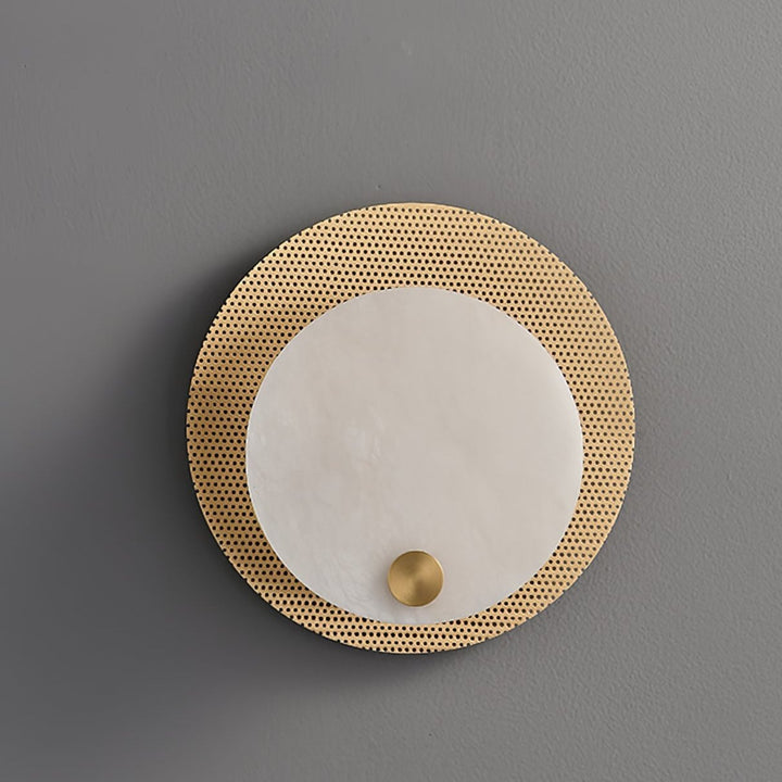 The Evelyn Wall Sconce features a perforated brass disc surrounding a luminous glass orb, casting a warm, diffused light that adds a soft glow to walls. Its contemporary yet timeless design complements both modern and classic spaces, adding subtle sophistication.