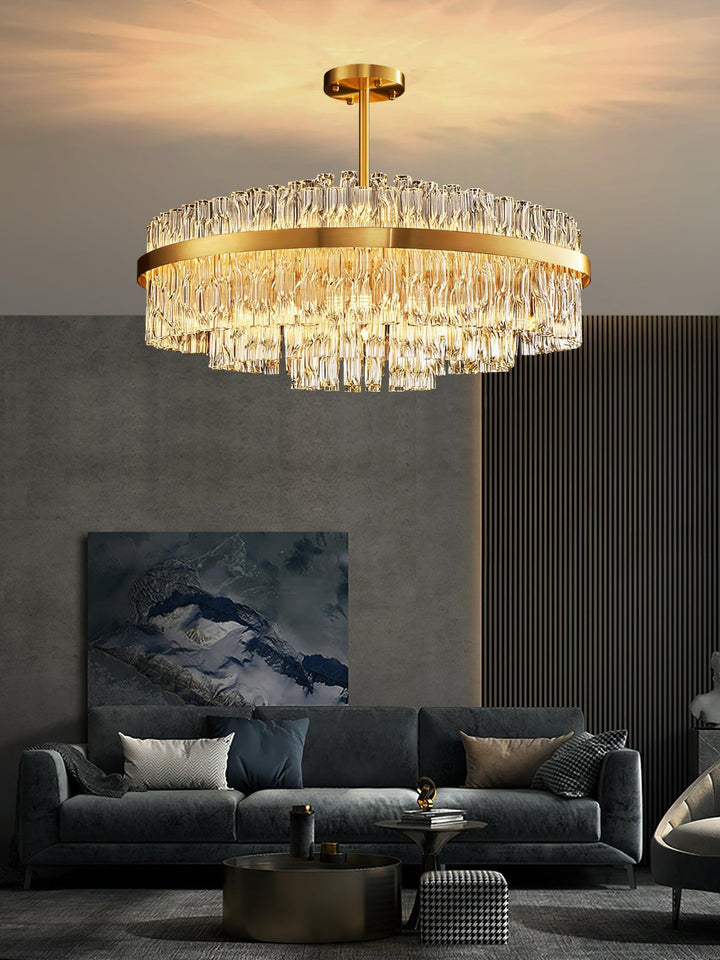 Brighten up any room with this unique Gold & Clear Rod Chandelier! Its clean lines and metal detailing give it an elegant, high-end look, while its glass rods refract the light and fill the space with a warm, cozy ambiance. Perfect for making a statement of sophistication - without taking yourself too seriously!