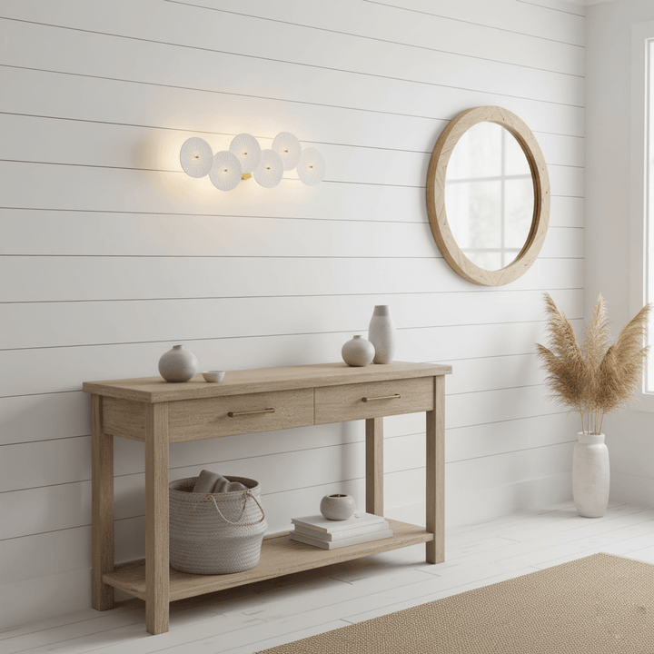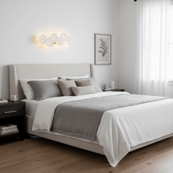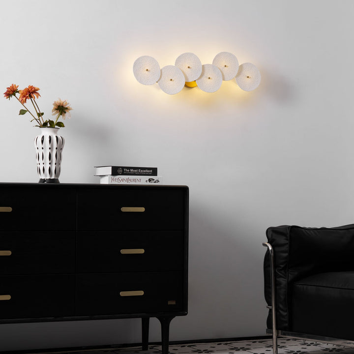 When illuminated, each petal glows warmly, offering a soft and inviting light that reflects off the metallic elements, creating a harmonious play of light and shadow. The Lotus Cascade Wall Lamp is an artistic statement piece that brings a harmonious balance to any interior, perfect for a meditation space, an elegant entryway, or a sophisticated living room. It is a testament to the serenity and beauty of nature, transformed into a stunning piece of home decor.