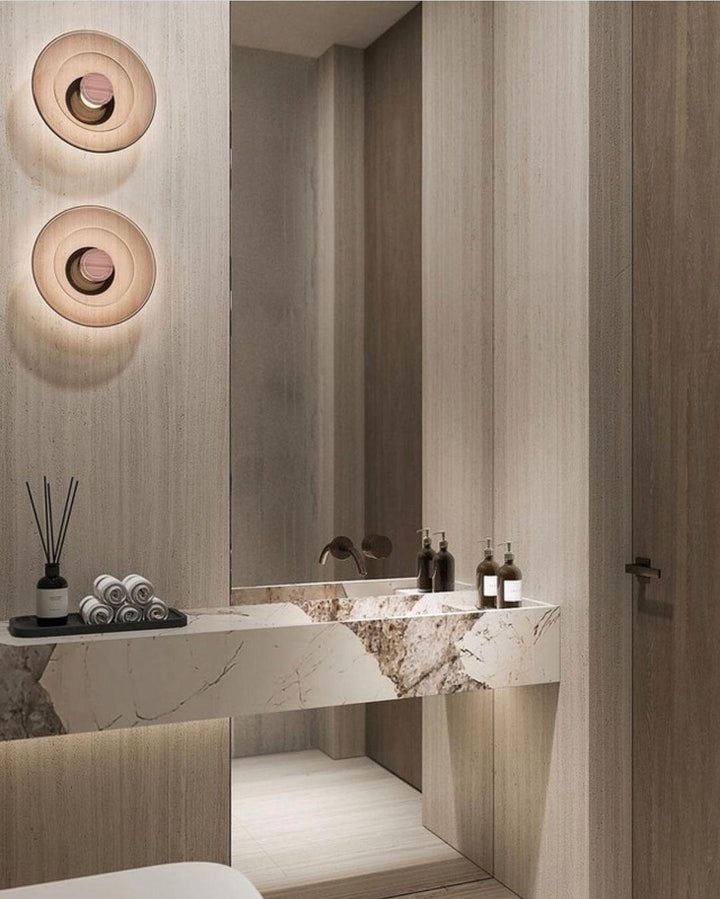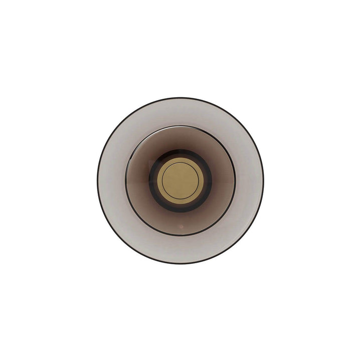 A soft interplay between full and half-full shapes, the Luna A Disc Sconce embodies a glamorous reference to the moon's diffused light. This Sconce is available in black hardware with smoked glass or gold hardware with gold glass.