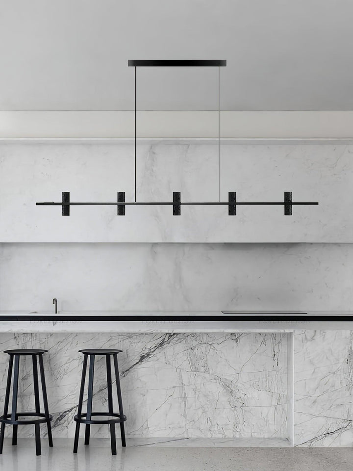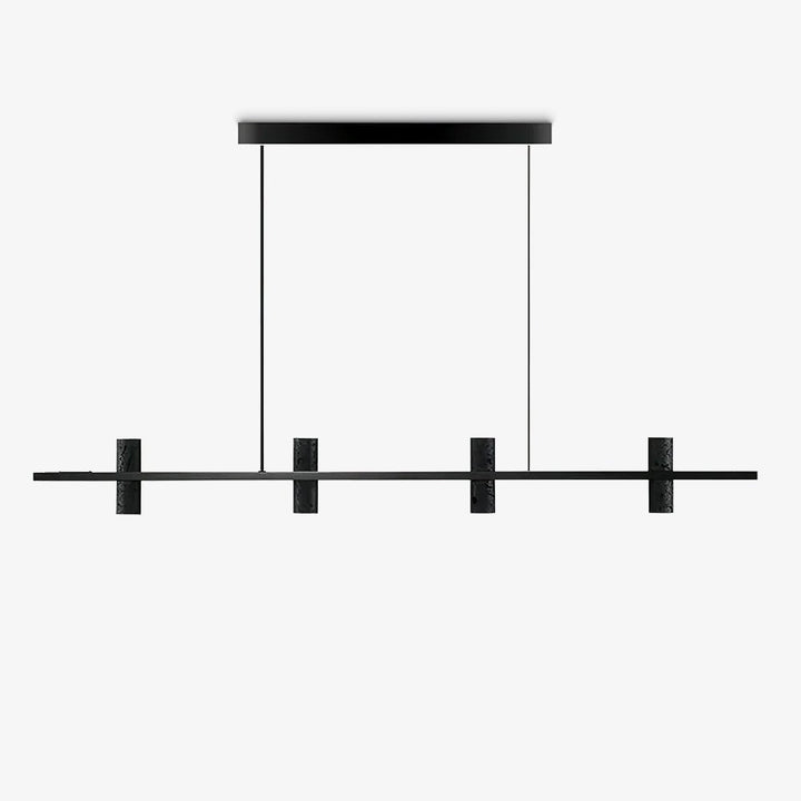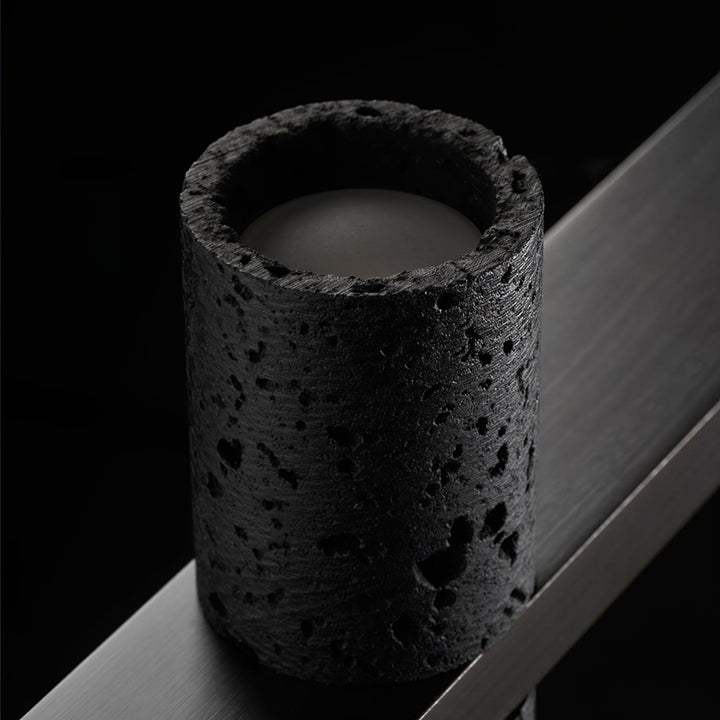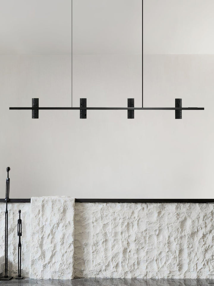 Pendant lightMeta Parallel Pendant Light are defined by their elegant, minimalist form that reinforces the visual interplay of balance and tension. Several pillars made of black hole stones are connected by a horizontal copper element. Black hole stone give the lighting a natural, porous texture that’s understatedly luxe. Multiple Meta Parallel lamps can be combined to create an installation-like sculpture.