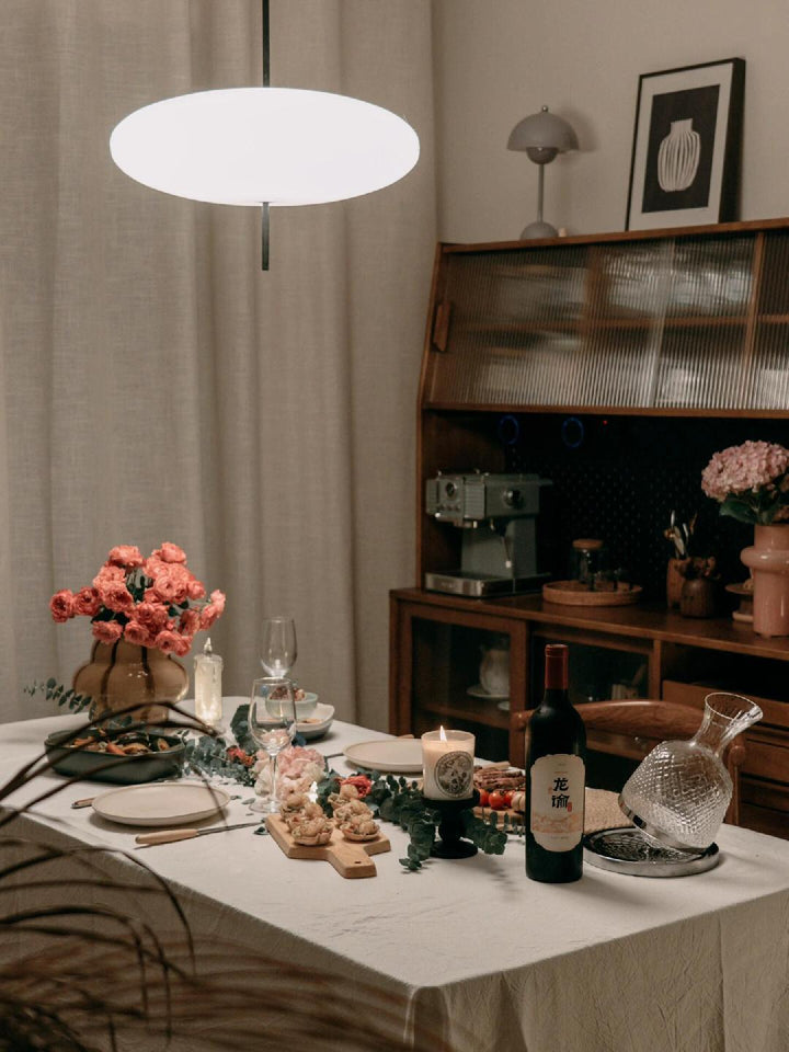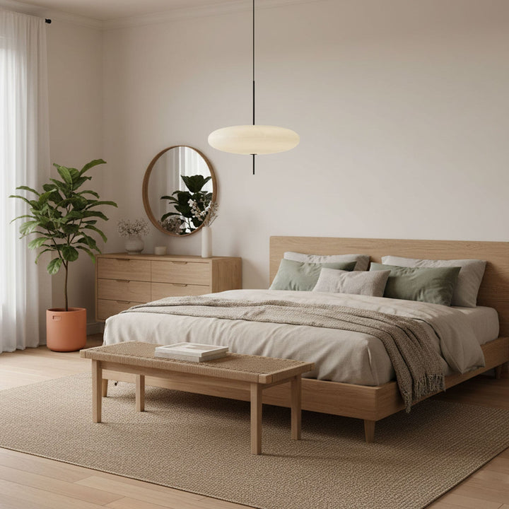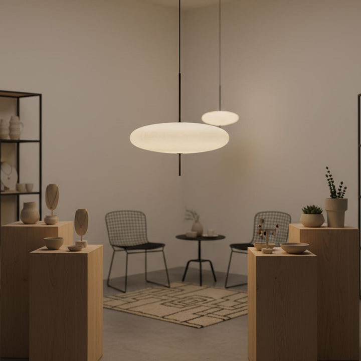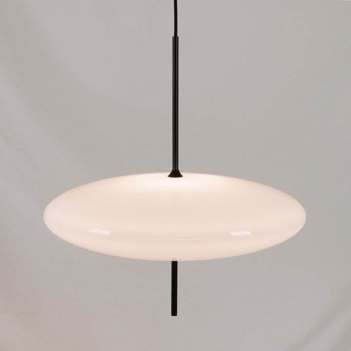 Model 2065 consists of a diffuser made of two joined opalescent saucers, suspended from the ceiling with a black-painted aluminium canopy. The simplicity of designer elliptical design and the lightness of the materials make for a seemingly weightless luminaire.