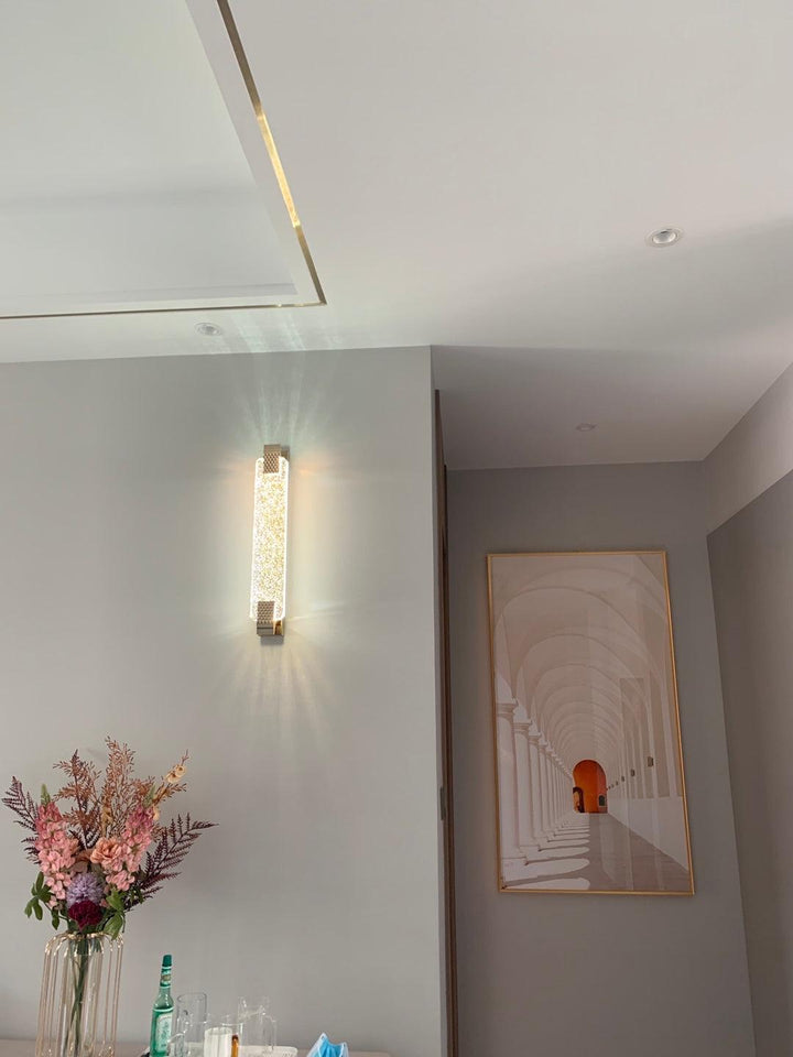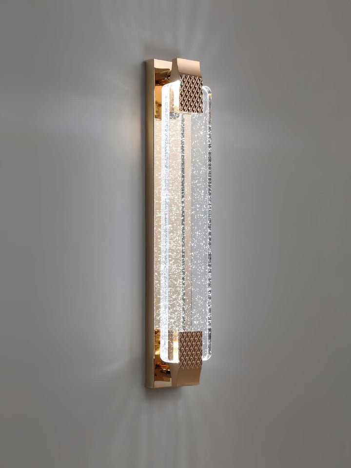 This clear decorative glass treatment feels like melted ice against a Rose gold back plate. We have two sizes in this wall sconce. They can be placed in any room in the house and hang vertically or horizontally.