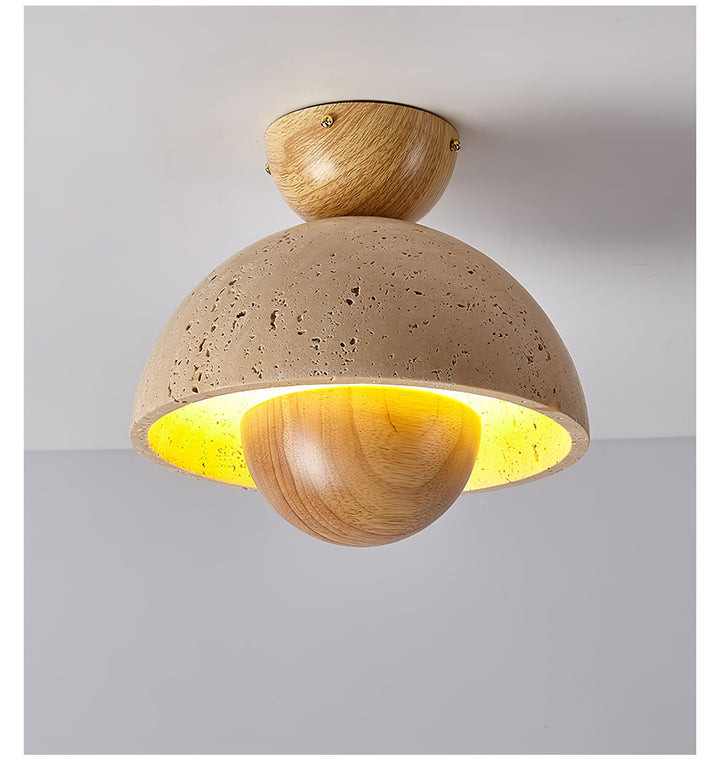 The Nerio Travertine Ceiling Light by Vakkerlight is a striking balance of earthy textures and sculptural elegance. Crafted with a dome-shaped travertine stone shade and accented by a smooth wooden sphere, Nerio evokes a celestial harmony—like a planet suspended in its orbit. The warm inner glow highlights the natural grain of the wood and the raw, tactile quality of the stone, creating a cozy yet modern ambiance. Ideal for entryways, kitchens, or serene living spaces, Nerio brings grounded sophistication to any interior.