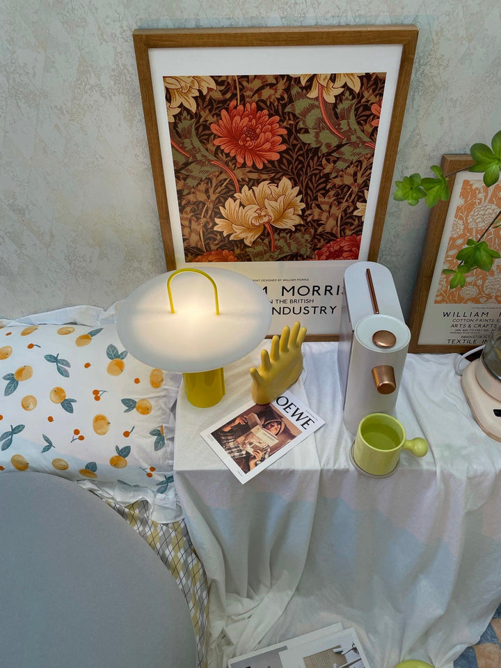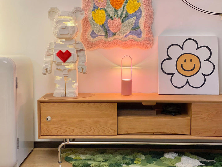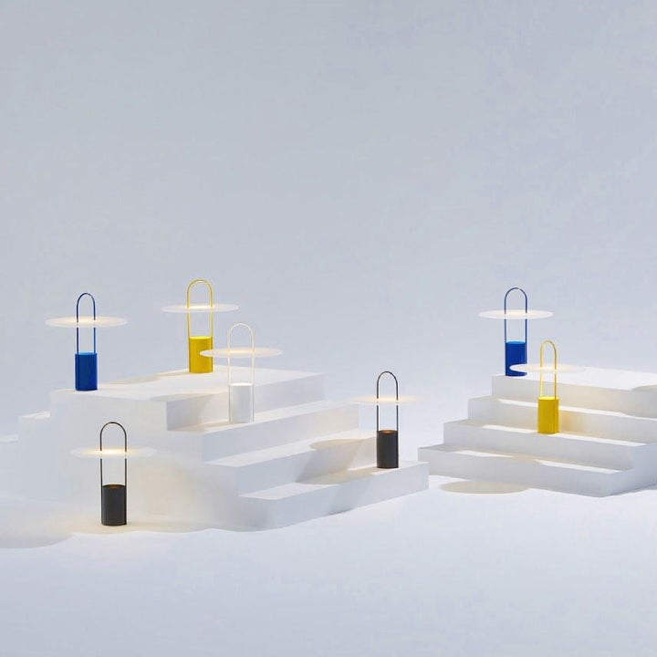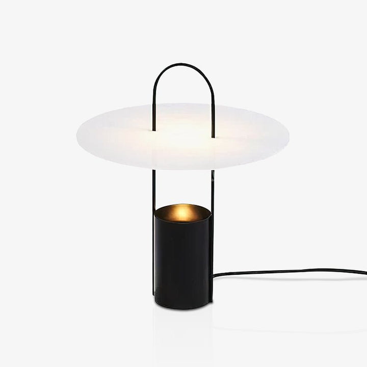 Composed of two distinct elements: a cylindrical lacquered metal base with carry handle, and a removable translucent plexiglass diffuser. The bulb is hidden in the base, while the translucent disc catches and diffuses the light to cast a warm, cosy glow.